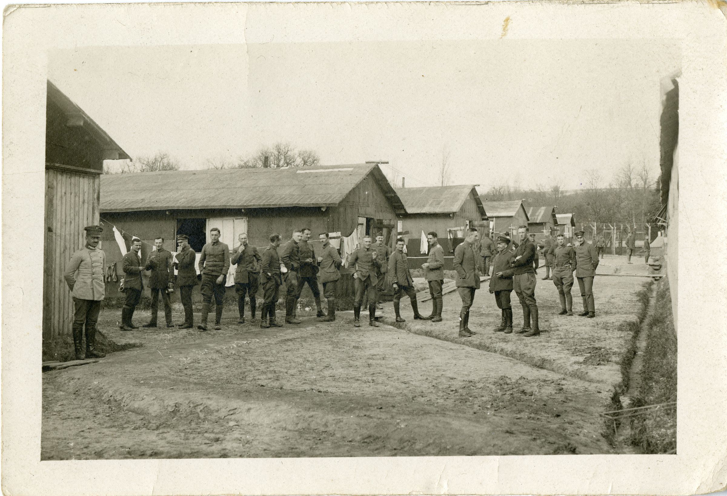 Black and white photograph print of several soldiers gathered in front of barracks, circa 1918. The print is 3.5" x 5". The soldiers are standing in different groups immediately in front of six barracks, visible on the left side of the image. Clothes lines can be seen strewn between each building, with a wire fence and trees visible in the distant background. The exact location where the photograph was taken is unknown.