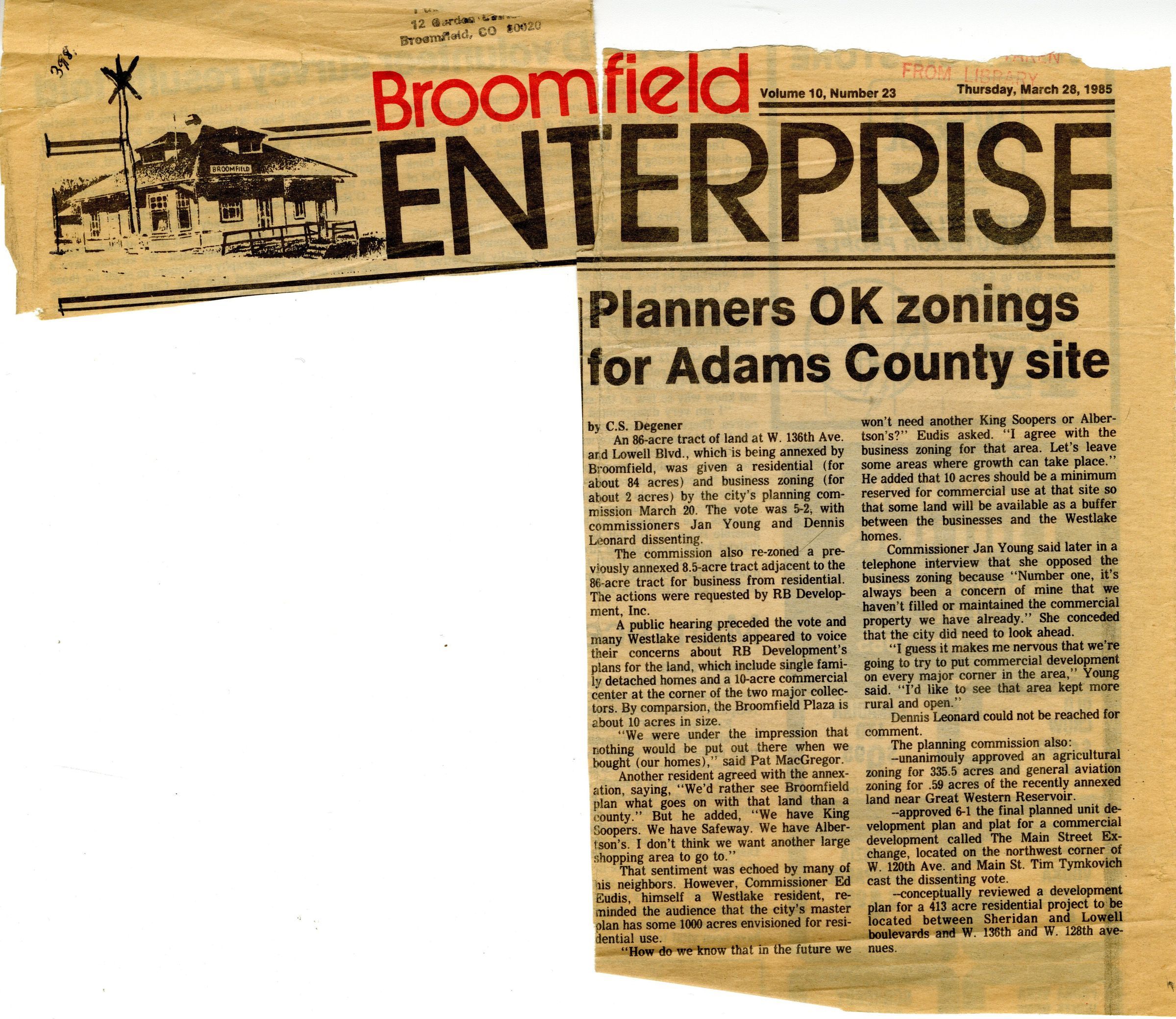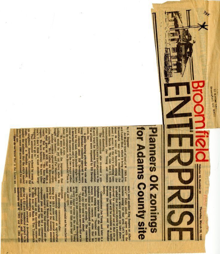 Article is cut out from Broomfield Enterprise. Article is about the annexation of land by Broomfield. Includes photocopy.Lexicon