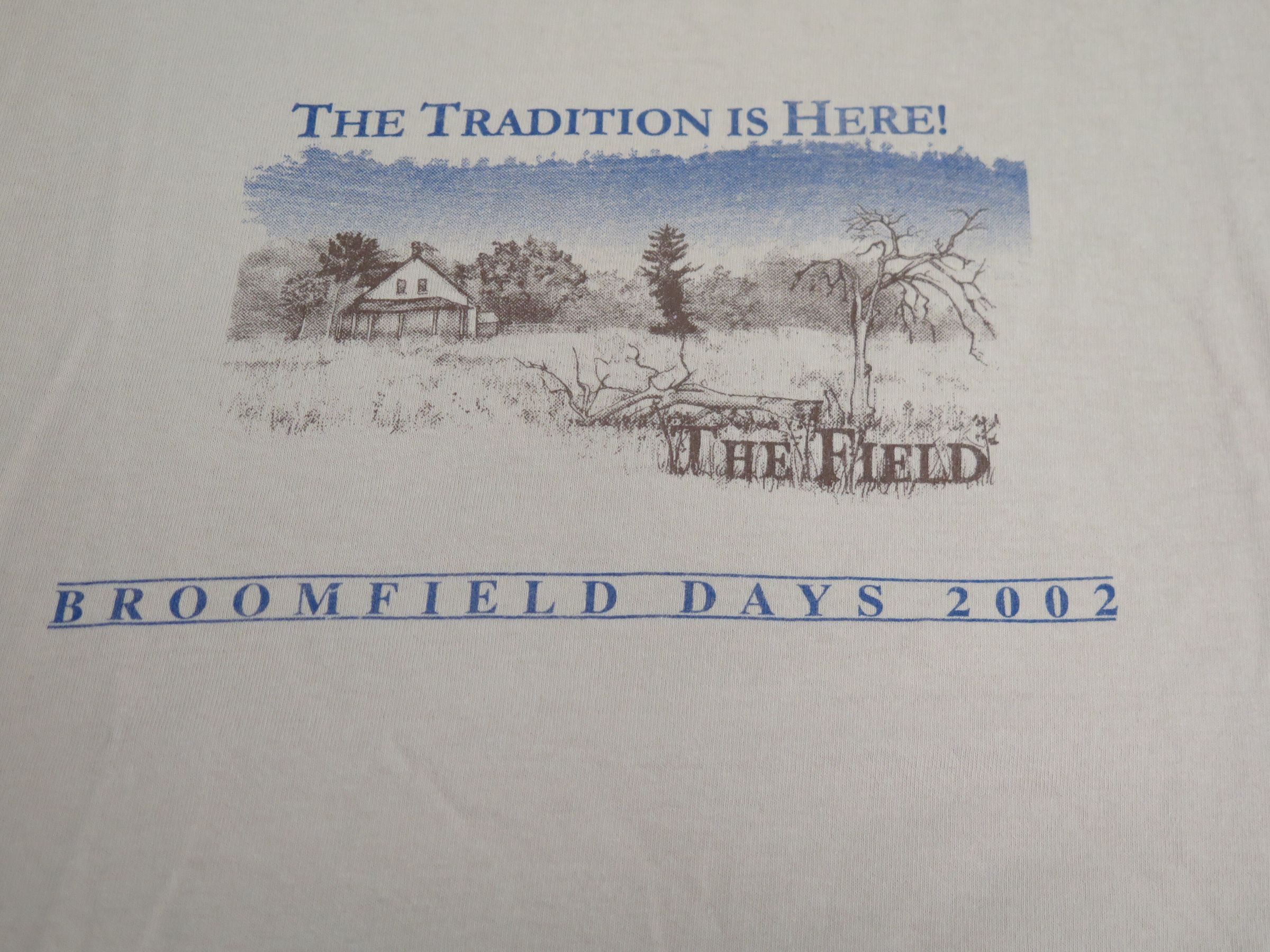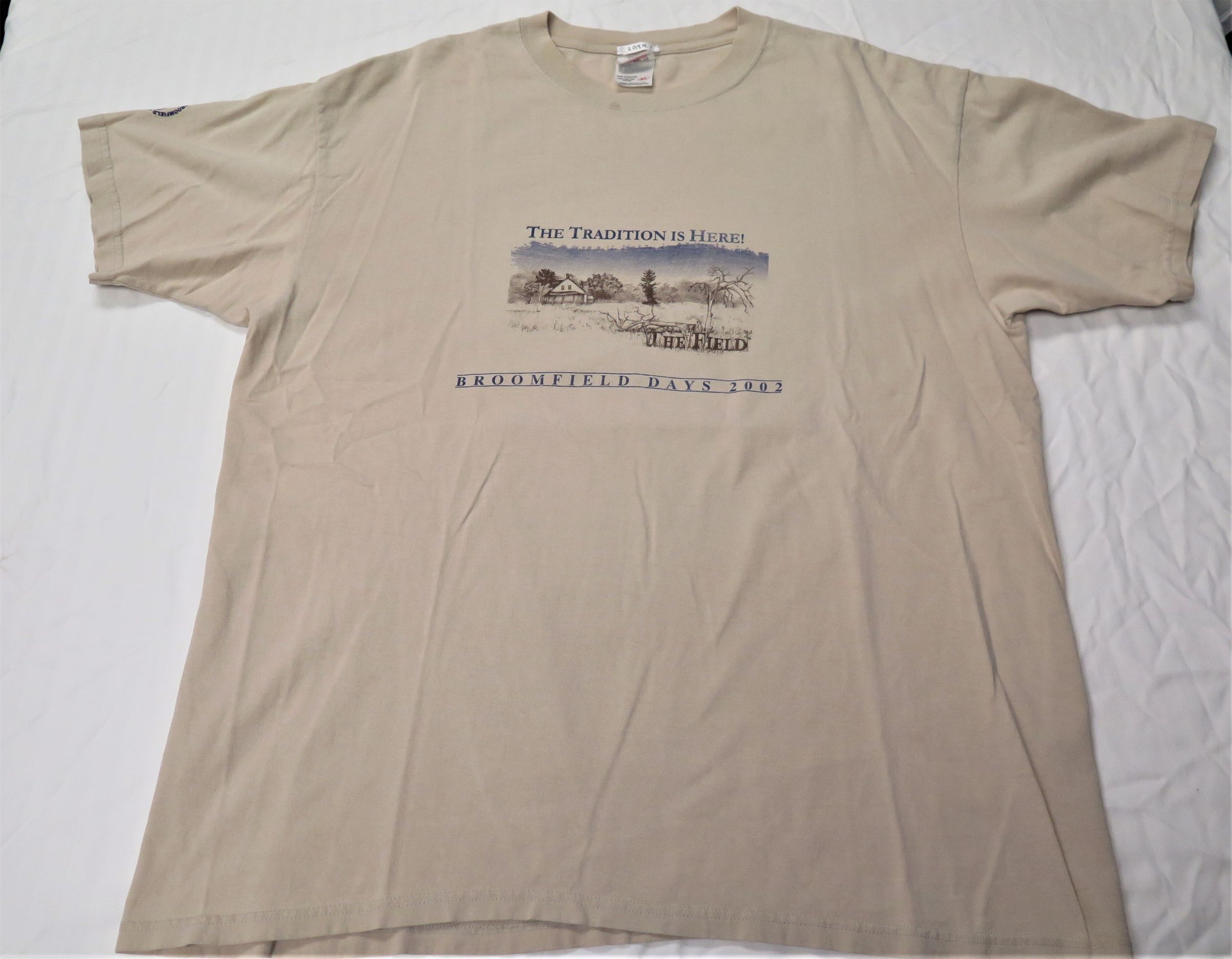 2002 Broomfield Days T-shirt, XLarge, tan color logo "The Tradition is Here" with photo of The Field City and County of Broomfield logo on right sleeve