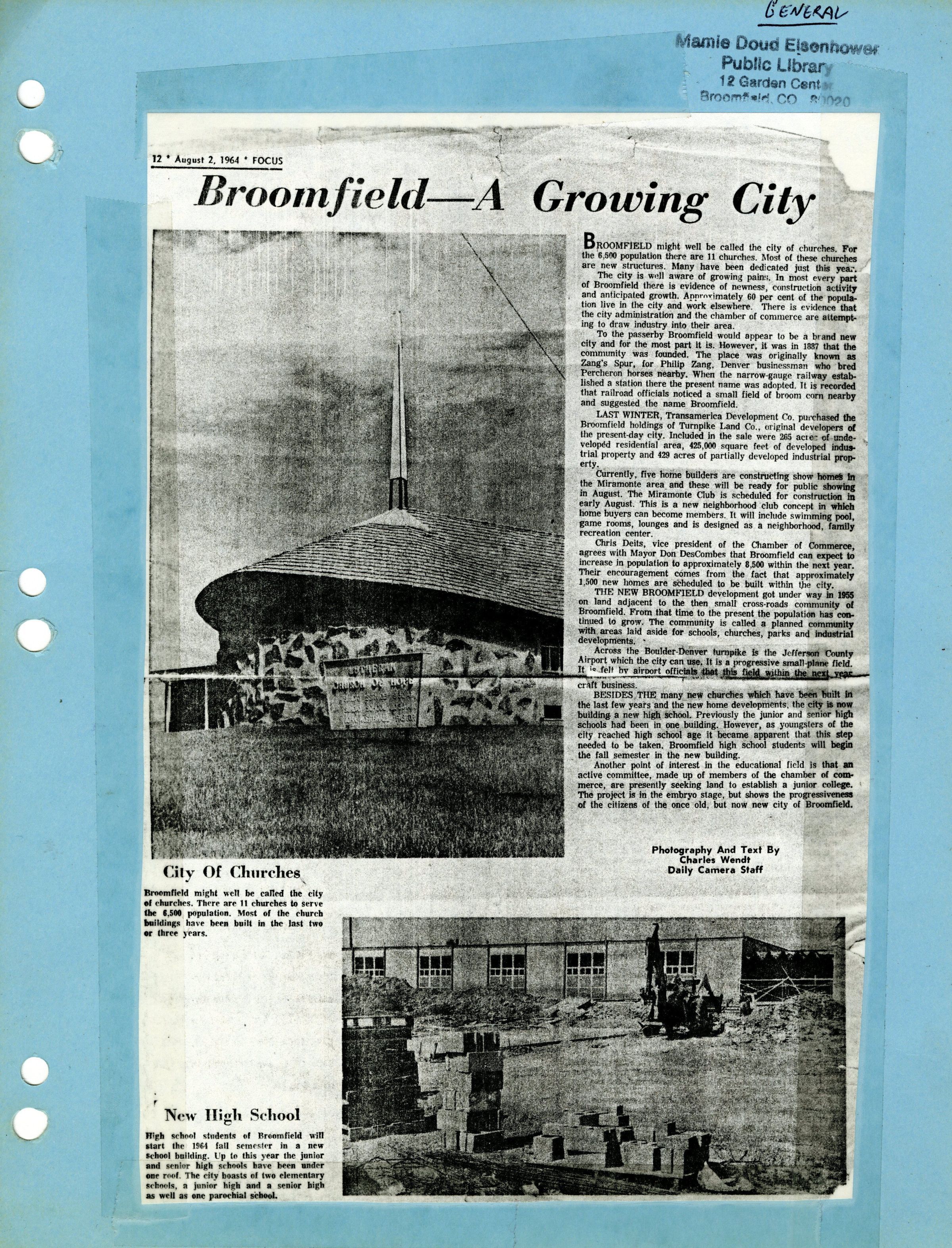 Photocopied article is from the FOCUS. Article is about the growth of Broomfield city, particularily the number of churches in the community (11 churches for 6,500 people). Also talks of Tranamerica company taking over from the Turnpike Land Co. also talks of new high school being built. Photocopy.