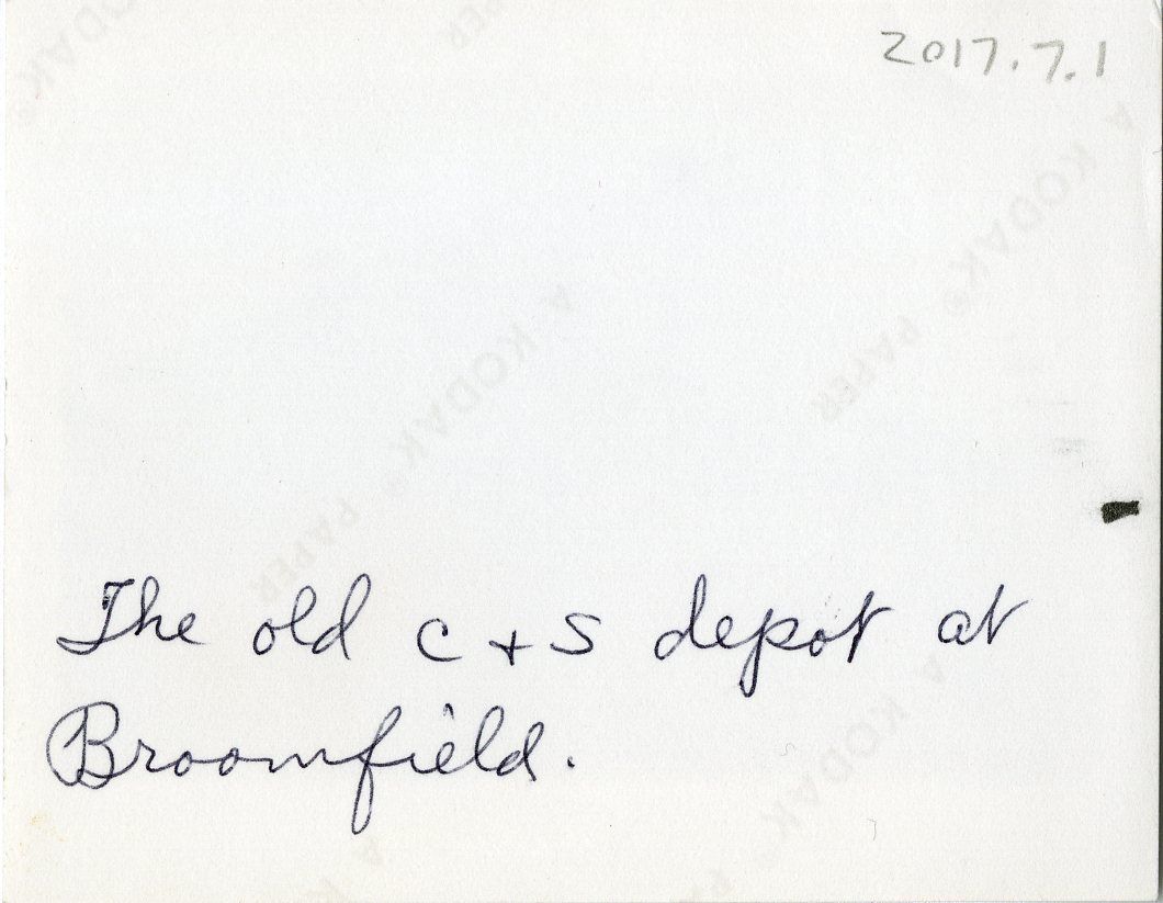 Inscription in black ink on the back states, "The old C & S depot at Broomfield." The inscription was likely made by Alice Albright, who probably took the photograph during a trip to Broomfield.Photograph Details
