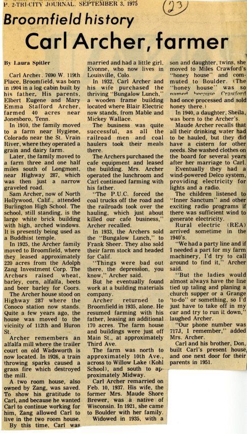 Article is cut out of Tri-City Journal. Article is about the Broomfield hisory and Carl Archer family.Lexicon