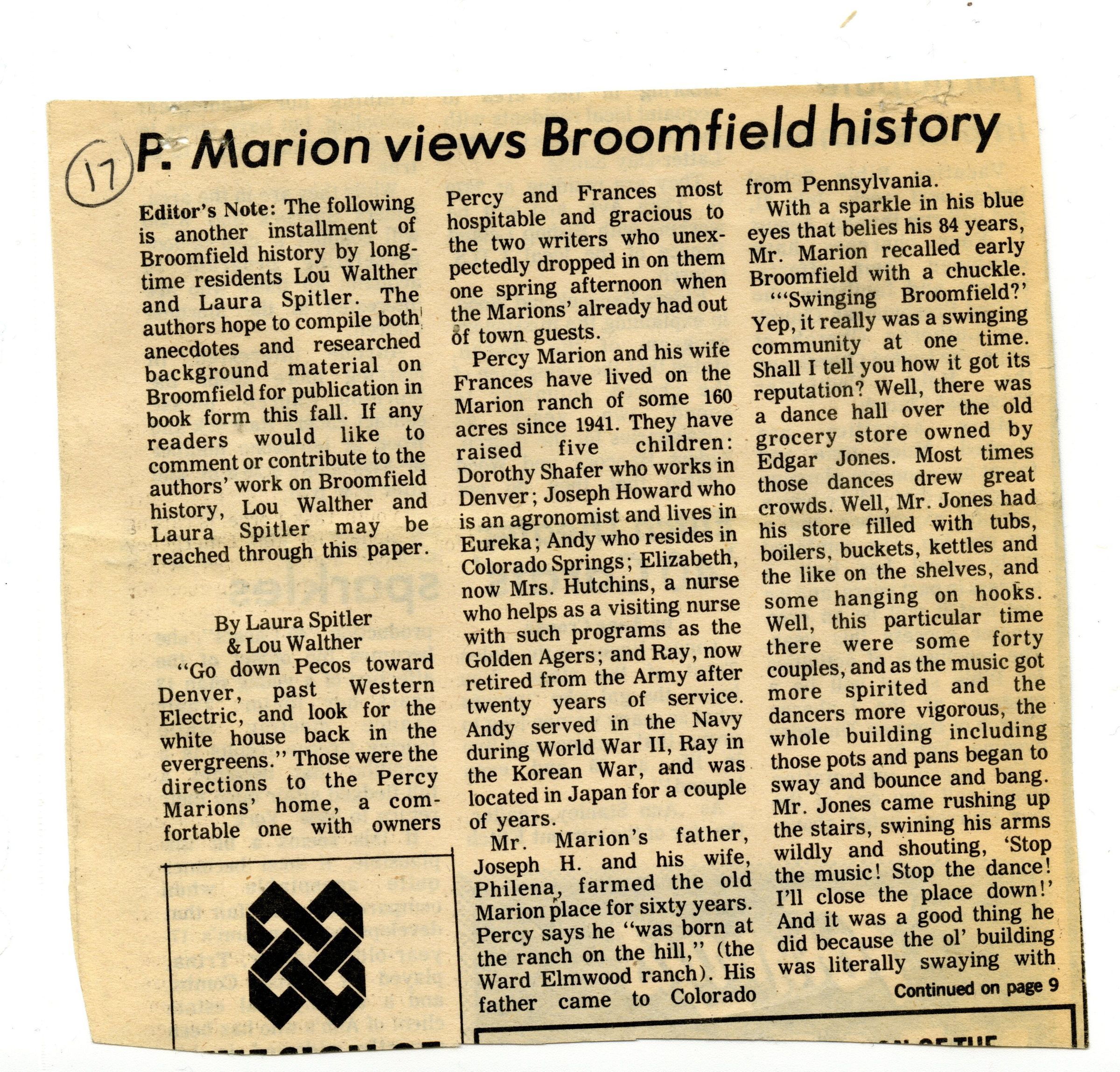 Article is about the history of Broomfield and the Percy and Frances Marion family.