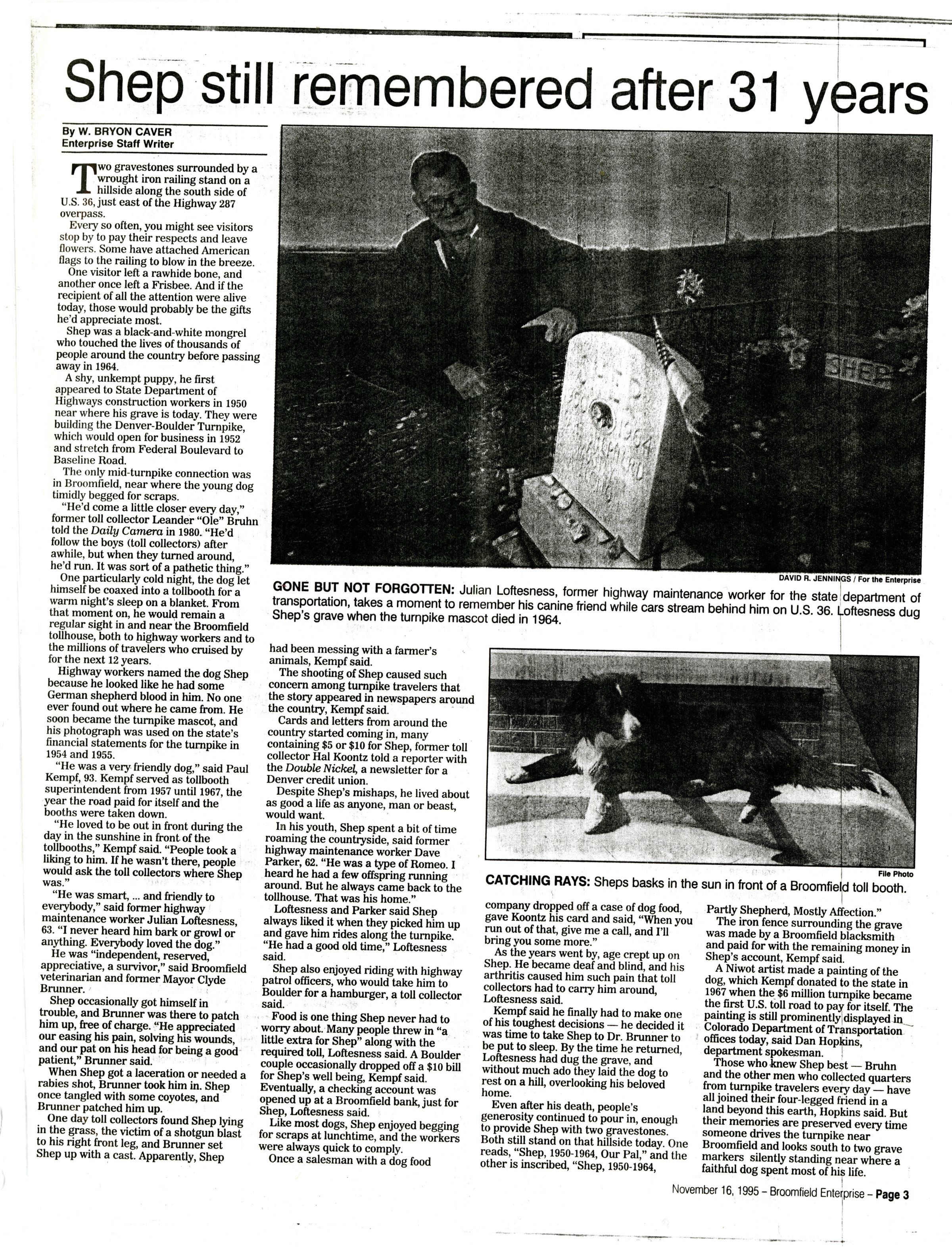 Photocopy of a newspaper article about Broomfield history and Shep.