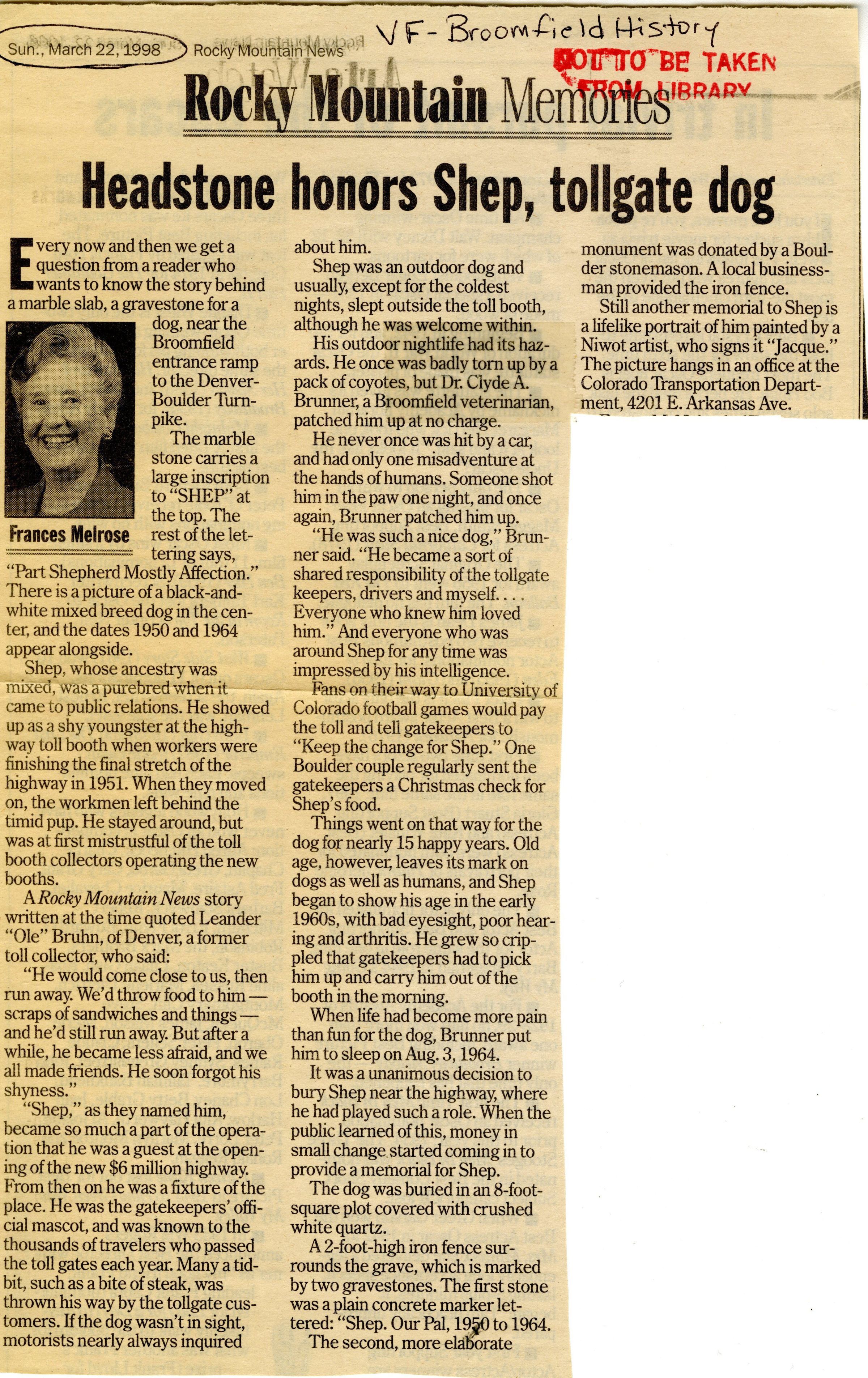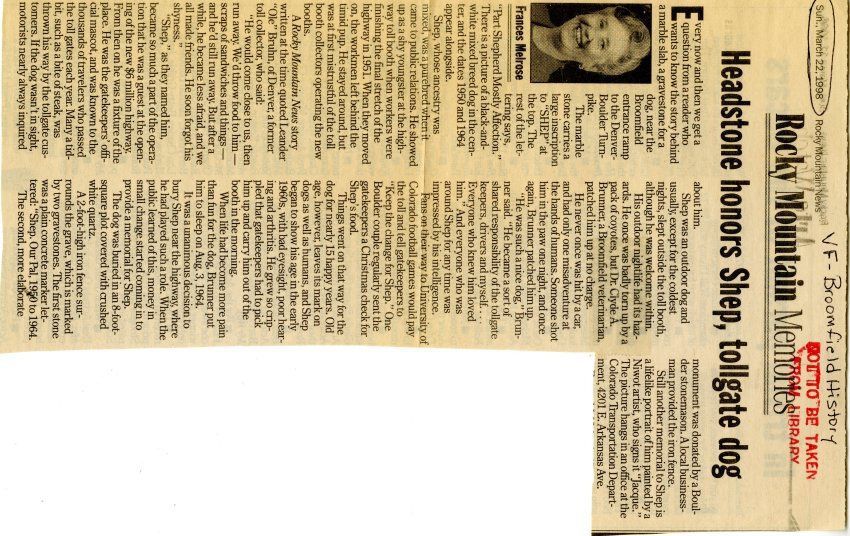Article is cut out of Rocky Mountain News. Article is about the history of Broomfield and Shep. Includes a photocopy.Lexicon