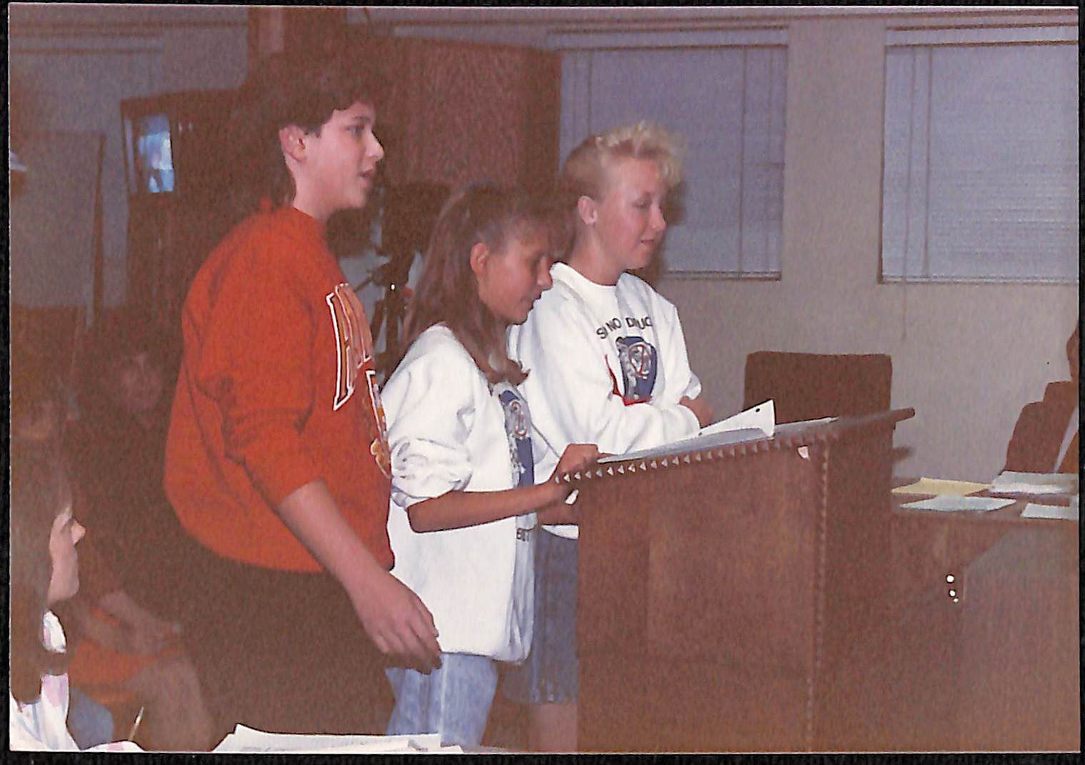 Item is a photograph printed on Kodak paper most likely taken sometime during the late 1980s or early 1990s. The picture centers around three teenage girls, likely members of the Teen Task Force, presenting to Broomfield City Council. The trio is standing in front of a podium and are reading off of a sheet of paper that rests on top of it. The girl on the left is wearing a red sweatshirt, and the two girls on the right are wearing matching "Say No To Drugs" sweatshirts, indicating that this might be a topic they are discussing with the councilmen. Crowds are visible sitting behind them; and the background is a light-colored room with windows shaded by blinds.Photograph Details