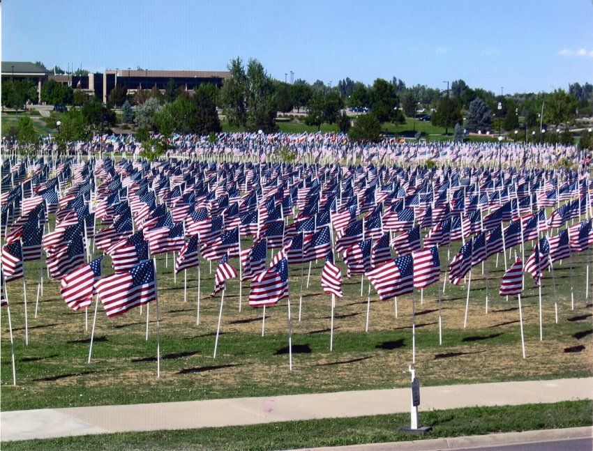Broomfield residents, in conjunction with the City and County of Broomfield, Broomfield Police, and North Metro Fire Rescue, placed approximately 5,753 three-by-five-foot American flags in the park space around the Mamie Doud Eisenhower Public Library. The flags represented the civilian victims and first responders who died from the attacks, and members of the coalition forces who had died in the wars in Iraq and Afghanistan. The event was a national effort, with Broomfield bringing one field to the Denver-Metro area. Proceeds from sponsored flags were ultimately used to create a permanent, local 9/11 memorial near the library.Collection
