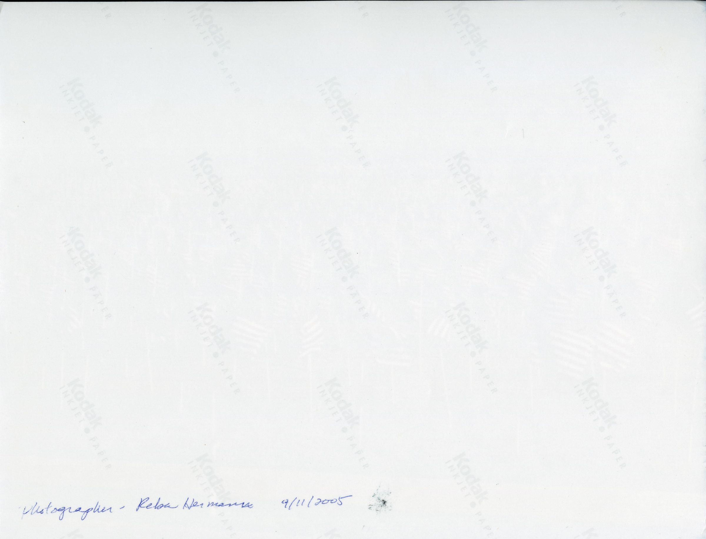 A color print of Broomfield's Healing Field Memorial, September 11, 2005. The print is 8.5" x 11", inkjet printing on photograph paper with a matte finish. The image shows several rows of 3' x 5' American flags standing in an open grass area, with the Mamie Doud Eisenhower Public Library and several trees in the background. Inscription on the reverse side, in blue ink, notes the photographer as Reba Hermansen, date taken September 11, 2005.