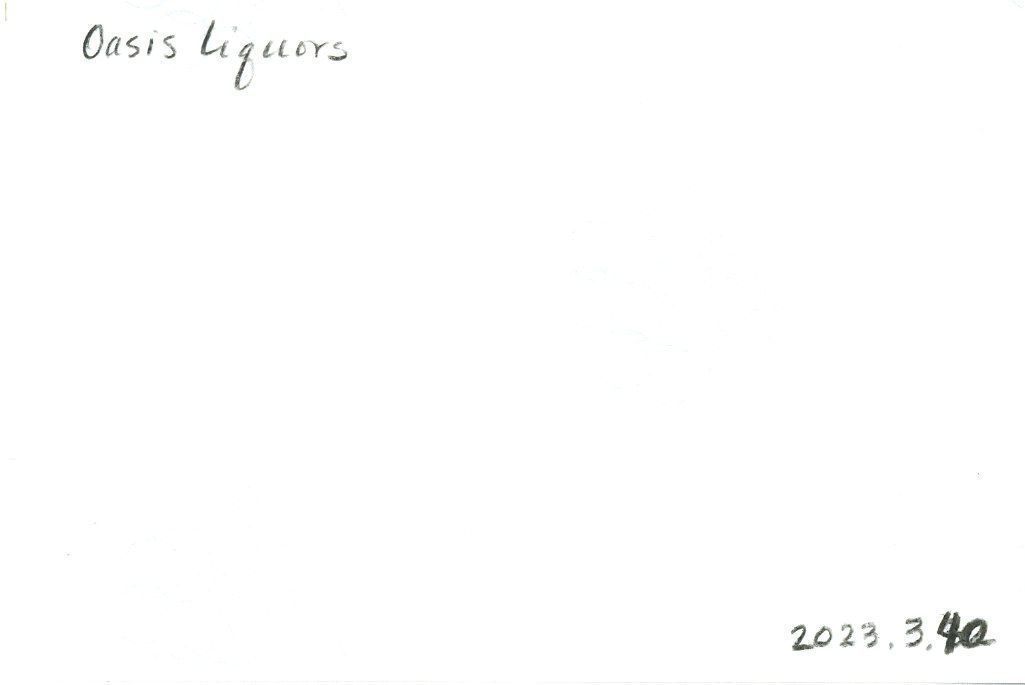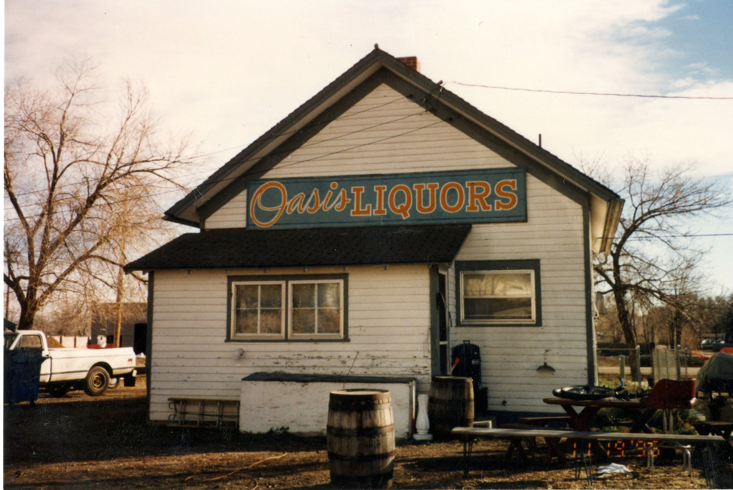 Color photograph of the Oasis Liquors building. Building with three windows shown, open gable, shingled roof, wood siding, painted beige, paint is chipping, green trim. White pickup to left of building, wine barrels, table and chairs in foreground. Building is believed to have been demolished. Photo taken 11/19/1996.