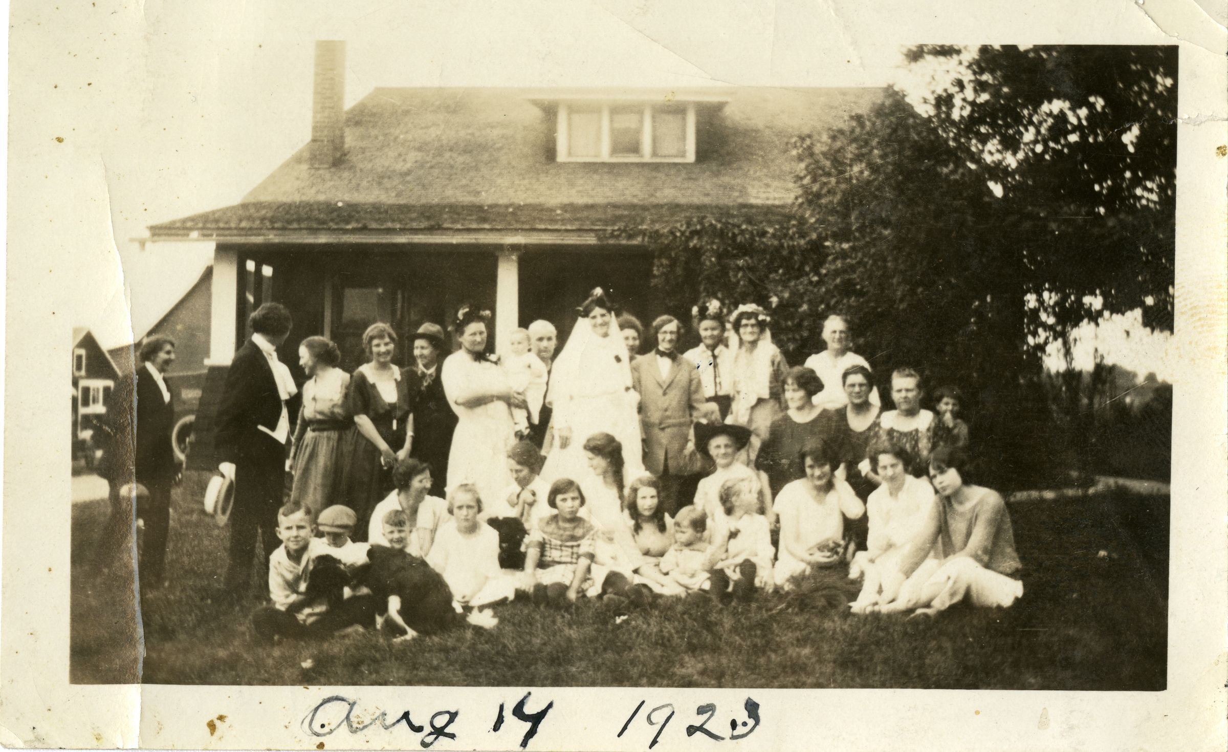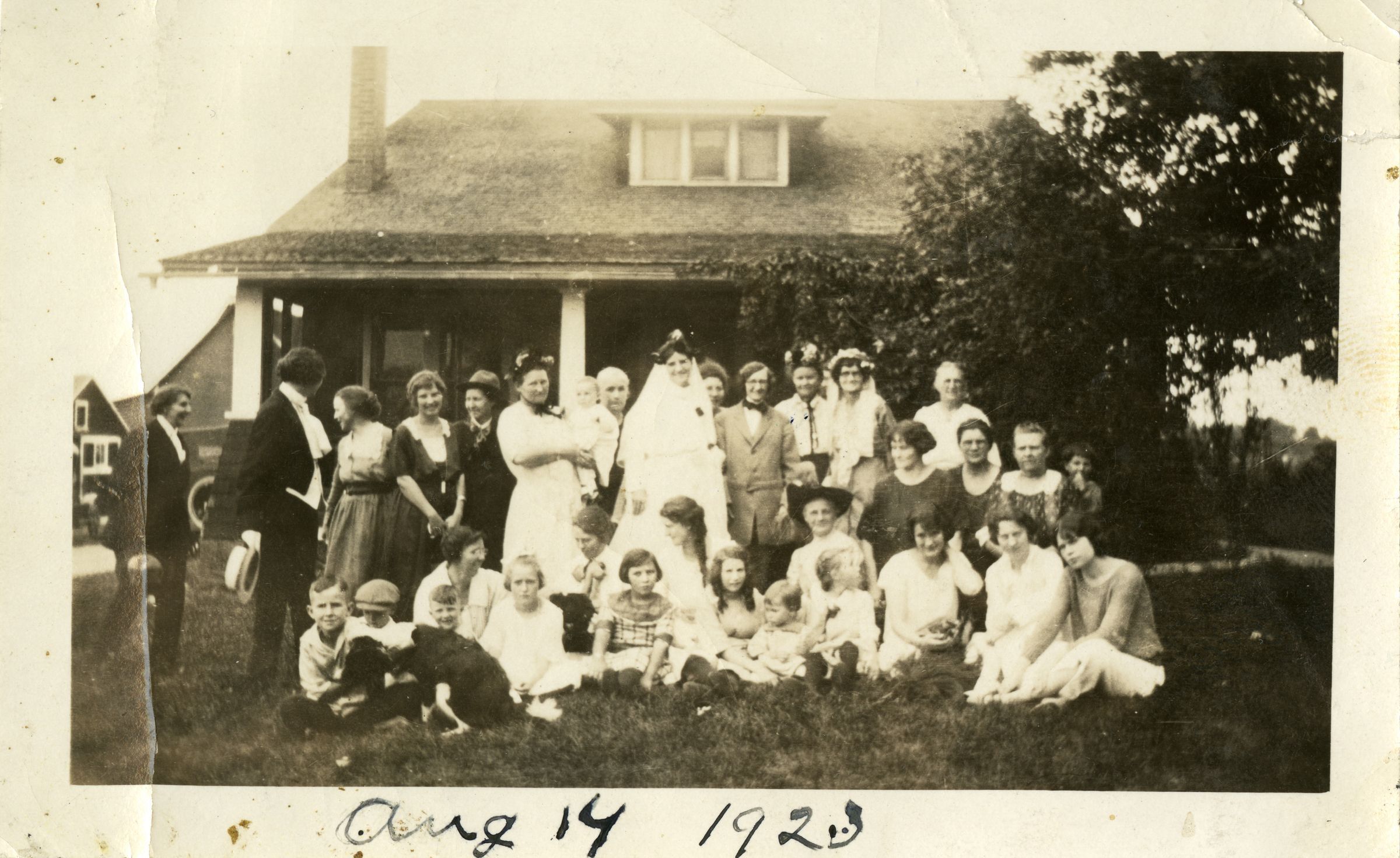 Black and white photograph print of a wedding on the Crawford family property, August 14, 1923. The print is 2.75" x 4.5," silver gelatin. The wedding was likely that of Miles and Emily Crawford. 33 individuals and a dog are shown with Emily Crawford in wedding gown in the center.
