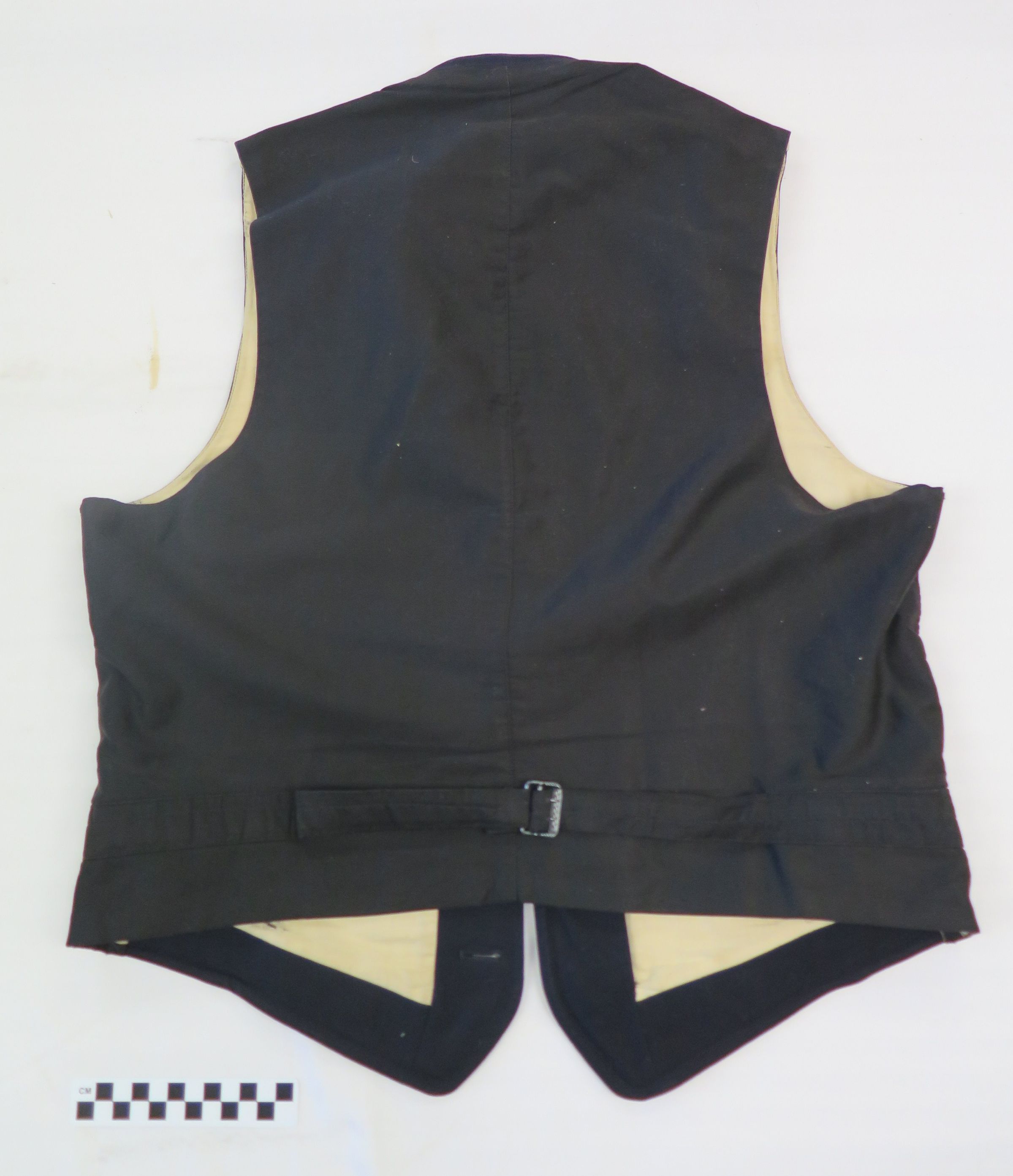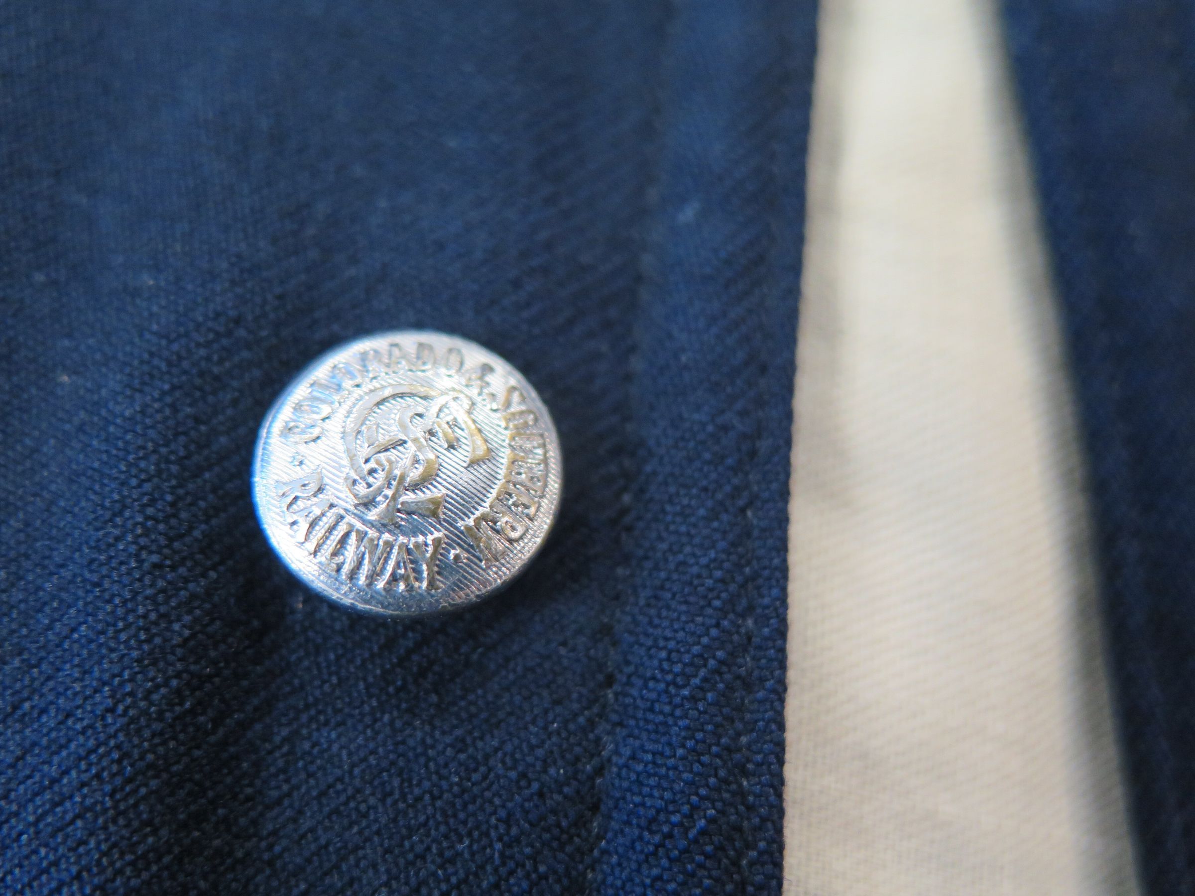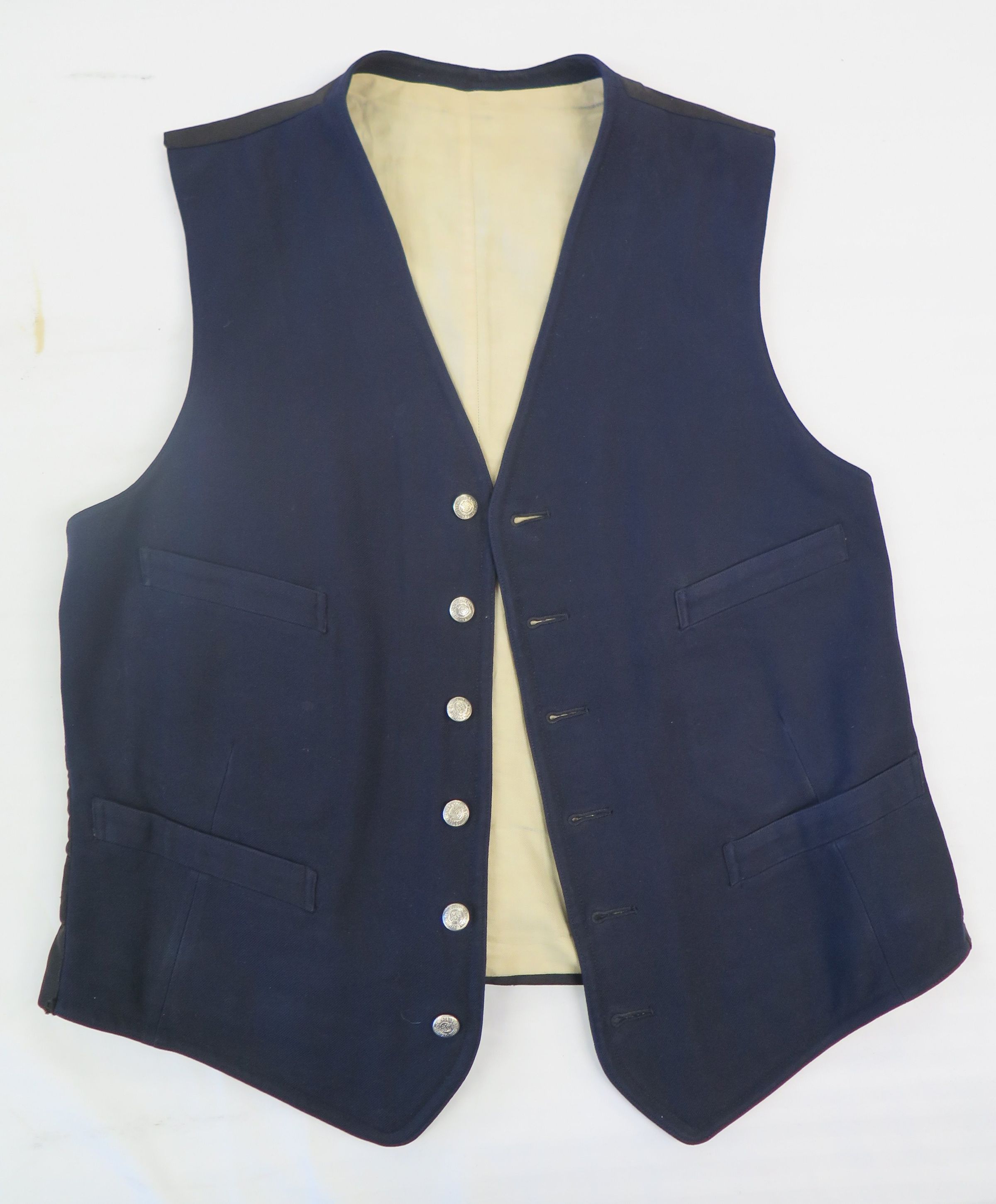 Colorado and Southern Railroad worker uniform vest. Navy wool with silk(?) cream interior. Buttons read "Colorado Southern Railroad." Belonged to Roy Abraham McGlochlin (1909-1983).