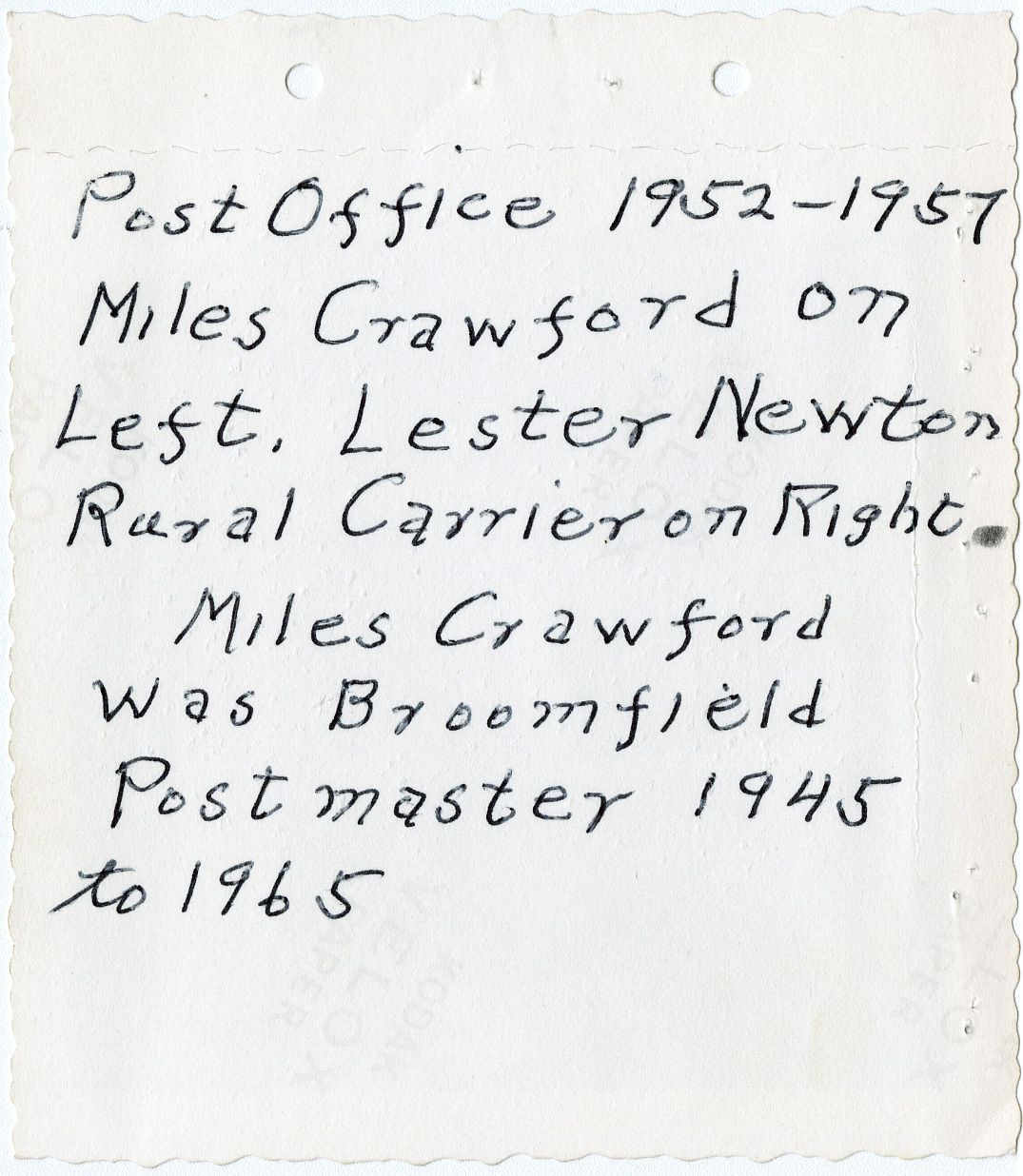Related photographs and papers were originally owned by the Crawford family and later donated to the Broomfield Depot Museum in 2013. All material is part of the same photographic and archival collection.