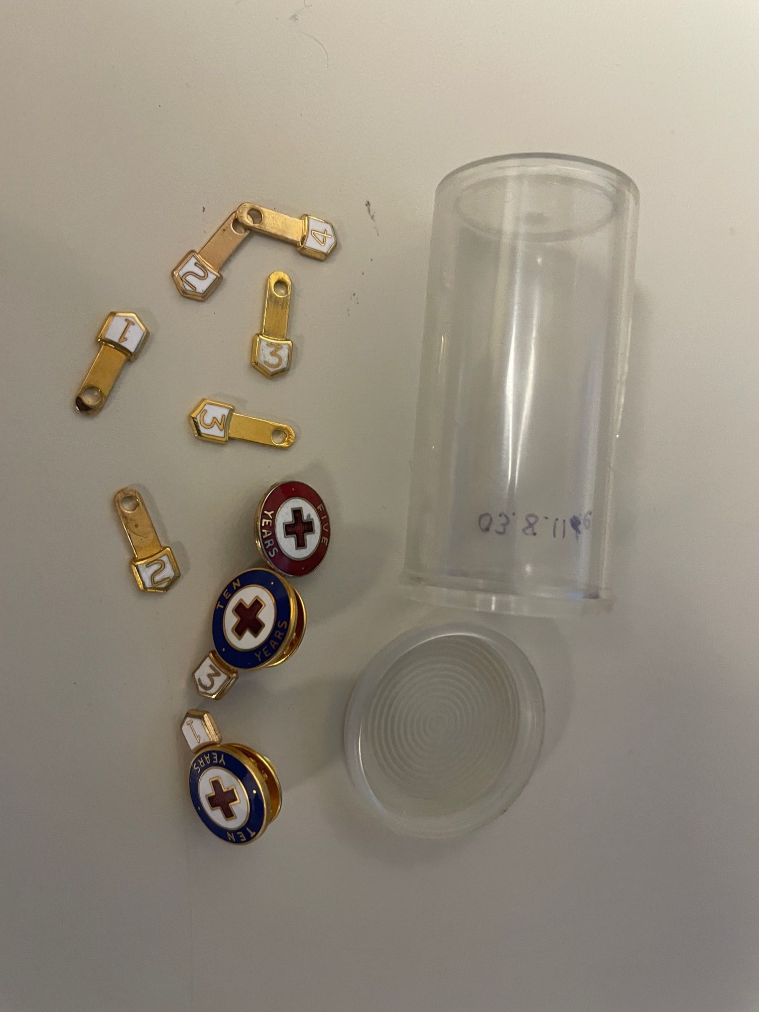 Pill container with pins found with 2003.8.11d. Container is clear. Contains 2 Ten Year achievement pins and a single Five Year pin. Also contains 8 little add-on markers for 1, 2, 3, and 4 years. Matches other pins found with Broomfield Volunteer Ambulance items from Jim and Jeanine Shafer.Collection