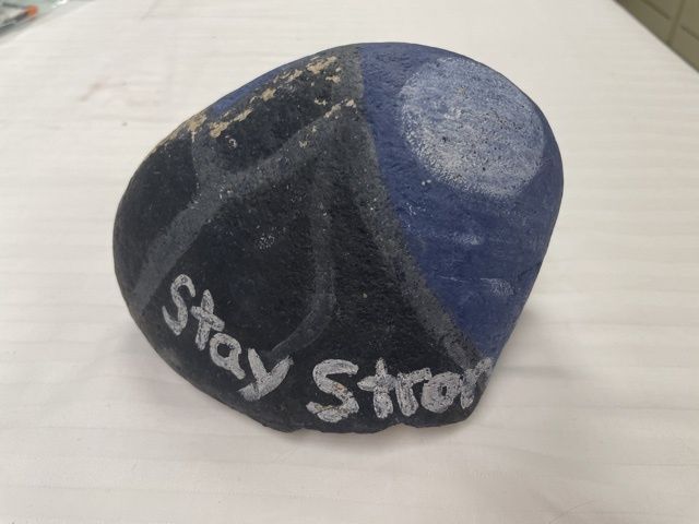 7 inches by 4 1/2 inches rock/stone painted with an image of mountains and a moon against a dark blue sky with the words "stay strong". In 2020, painted stones were popular to place as words of encouragement throughout town.