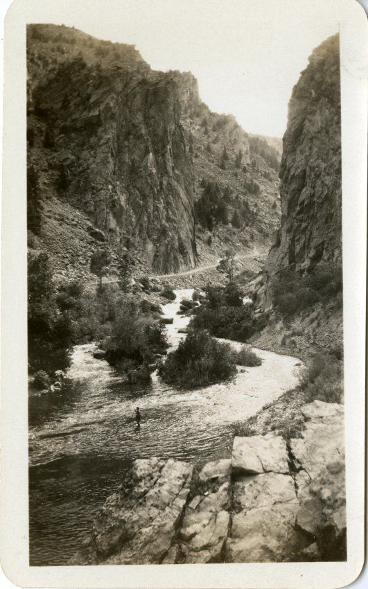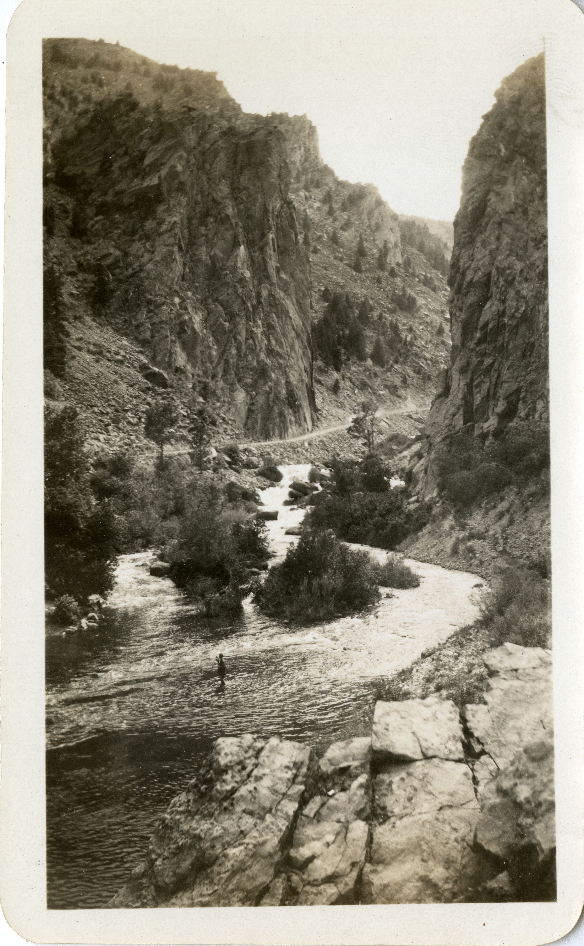 Black and white photograph print of Eldorado Canyon, 1931. The print is 2.75" x 4.5", silver gelatin. The image shows both ends of the canyon, with a winding river (likely South Boulder Creek) coming toward the viewer. Several trees and an unidentified person can be seen standing in and around the water.Photograph Details