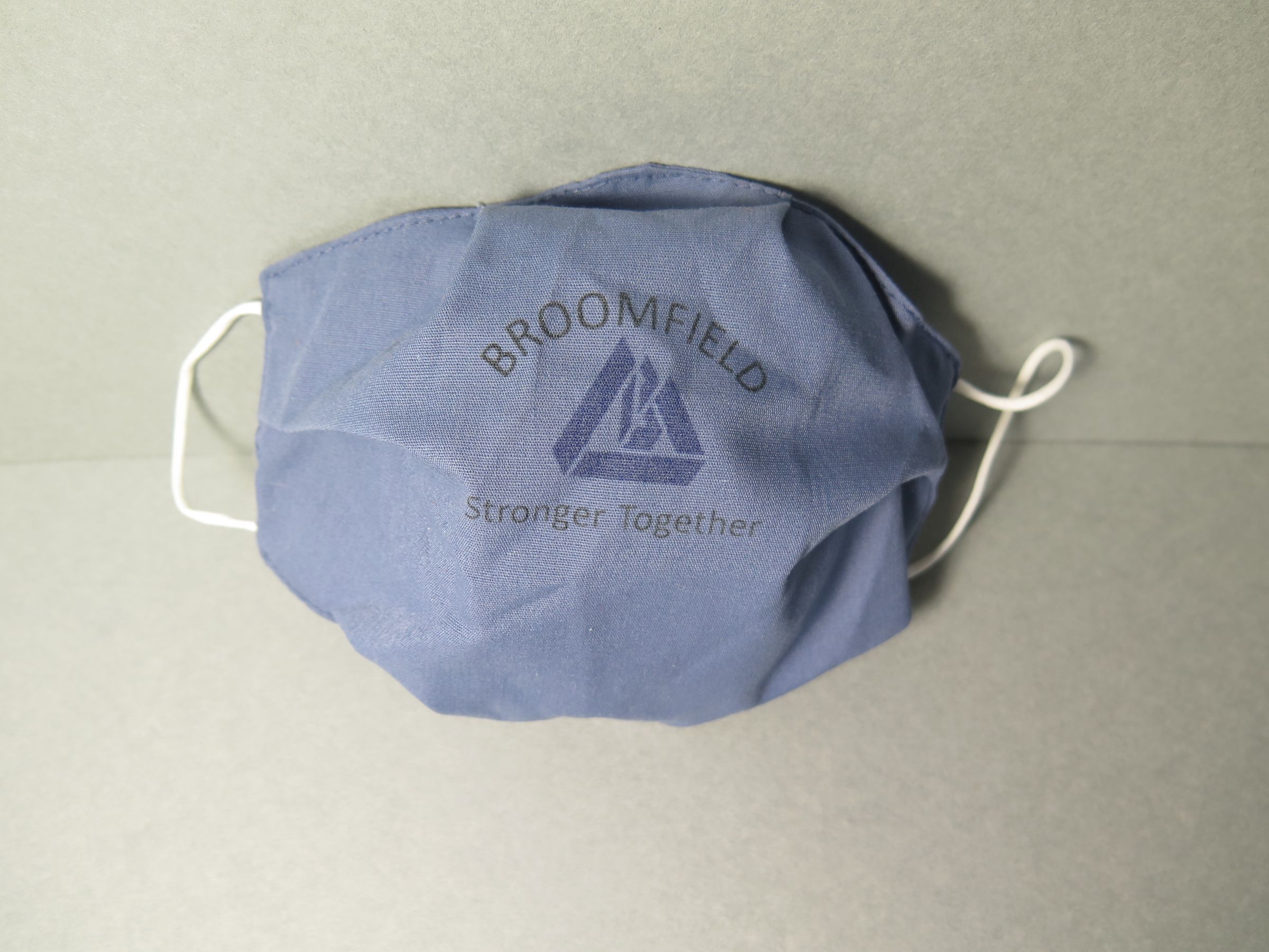 Blue Cloth mask with the words "Broomfiled, Stronger Together" with Broomfield Logo. Mask is used in the COVID-19 / Coronavirius Pandemic. These masks were given out to all employees of the City and County of Broomfield in 2020.