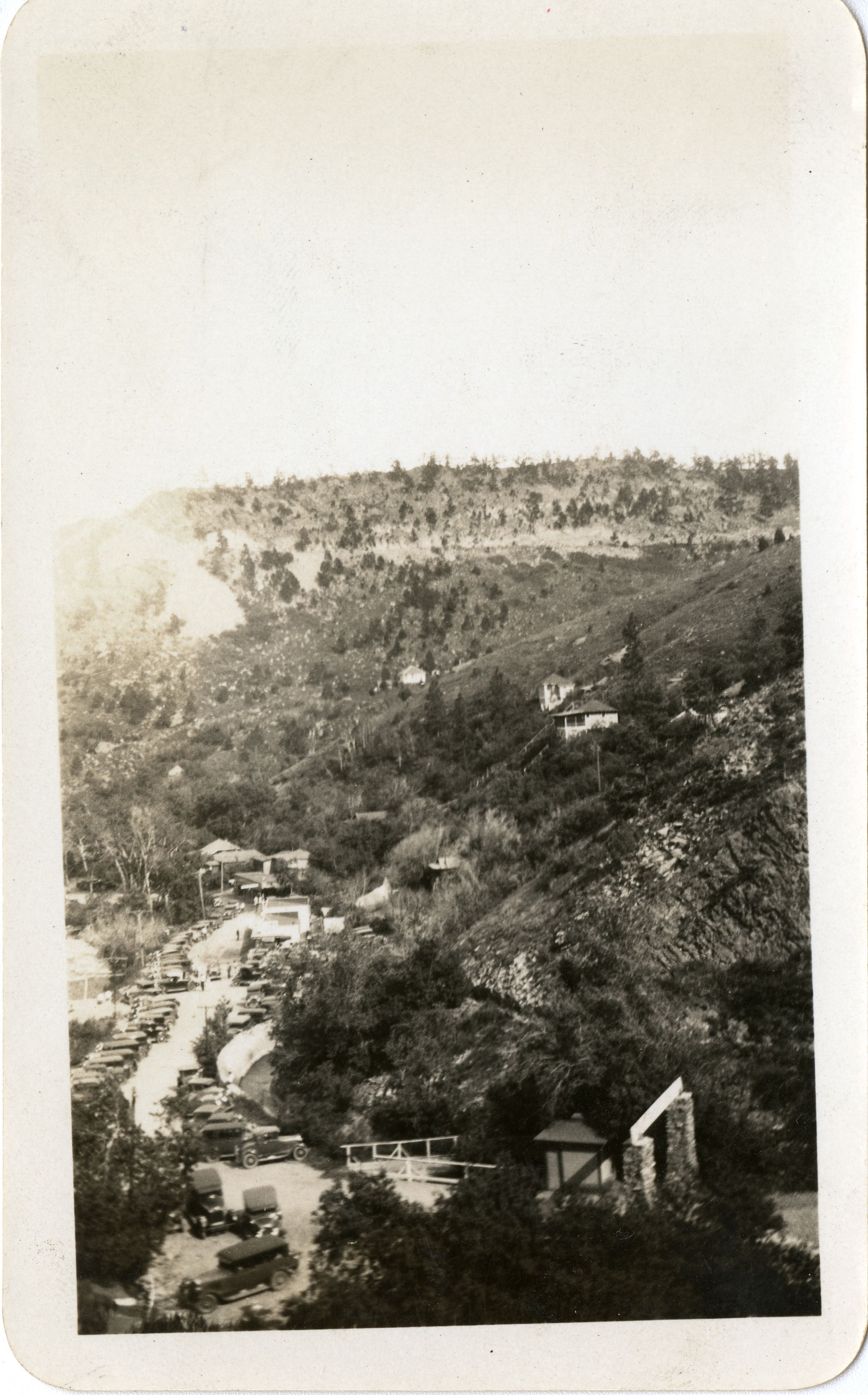Black and white photograph print of several automobiles parked at Eldorado Canyon, 1931. The print is 2.75" x 4.5", silver gelatin. The image shows a winding dirt road on the left with two rows of cars parked in different positions. To the right, an entryway to Eldorado Springs is visible by a small building, made of stacked stone pillars on either side of the road. Mountains and foothills encompass the background, with houses and trees scattered around on them.Photograph Details