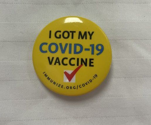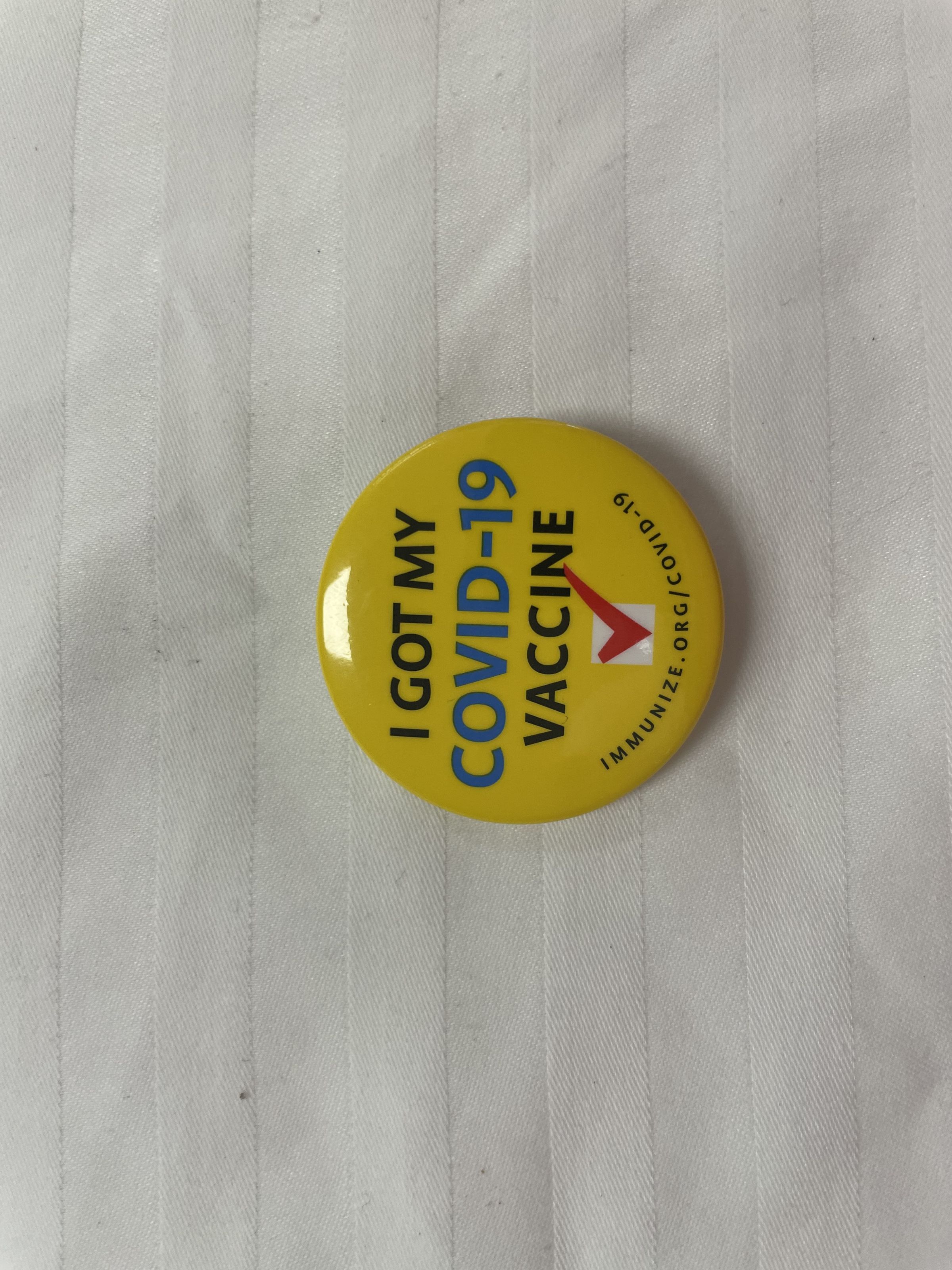 1 1/2 inch by 1/12 inch circular yellow pin with the words "I got my Covid -19 Vaccine" (Covid-19 in blue), with red check mark and link "immune.org/covid-19". This pin is received in some places once you get vaccinated. Pin is used to promote others to get their vaccine and to inform that the person wearing it got the vaccine.