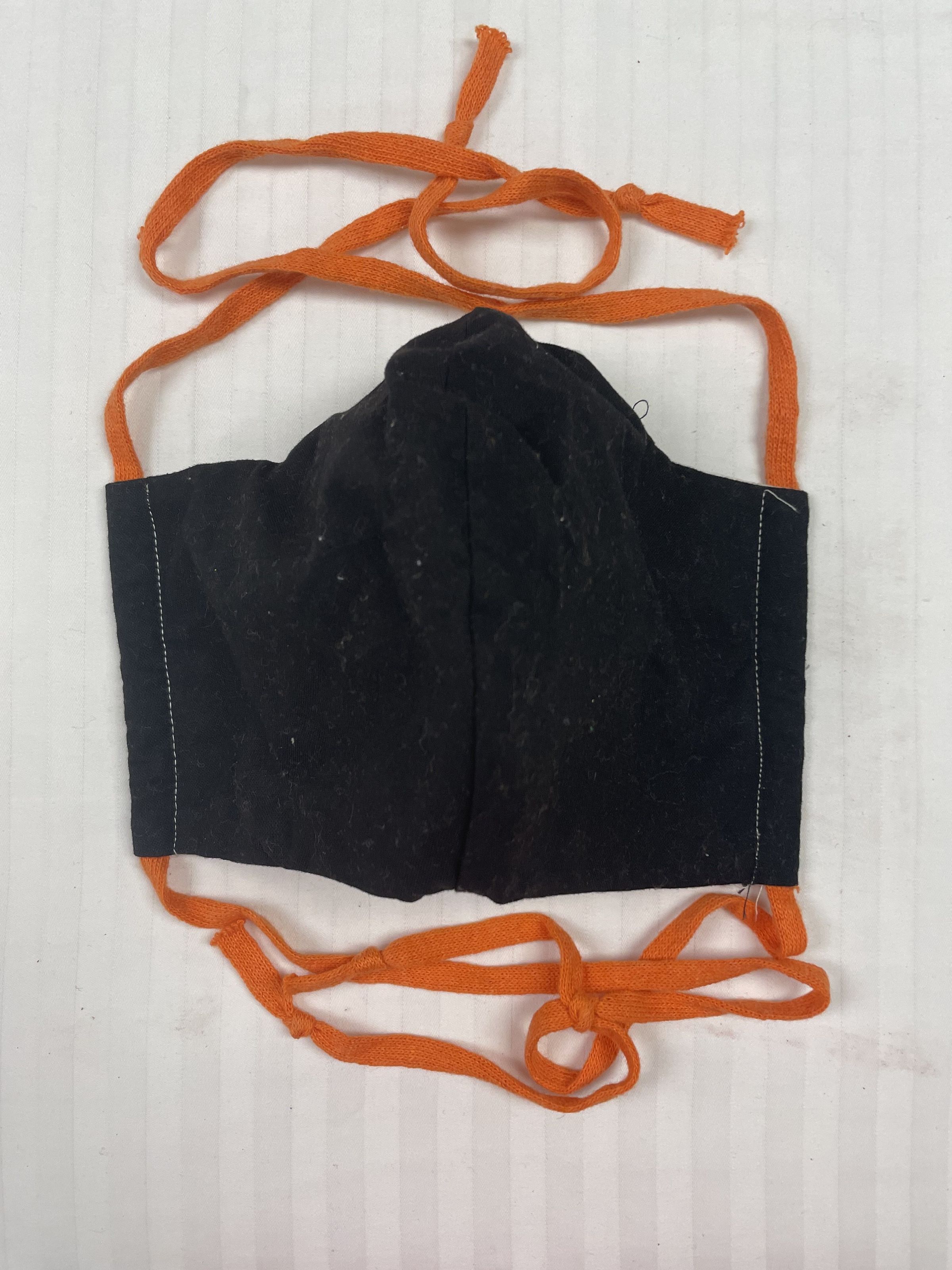 Black cloth mask with orange ties inside bag with instruction sheet. Instruction sheet gives diffrent ways to sterilize mask. Mask is used in the Coronavirius / COVID-19 pandemic to prevent germs from spreading.