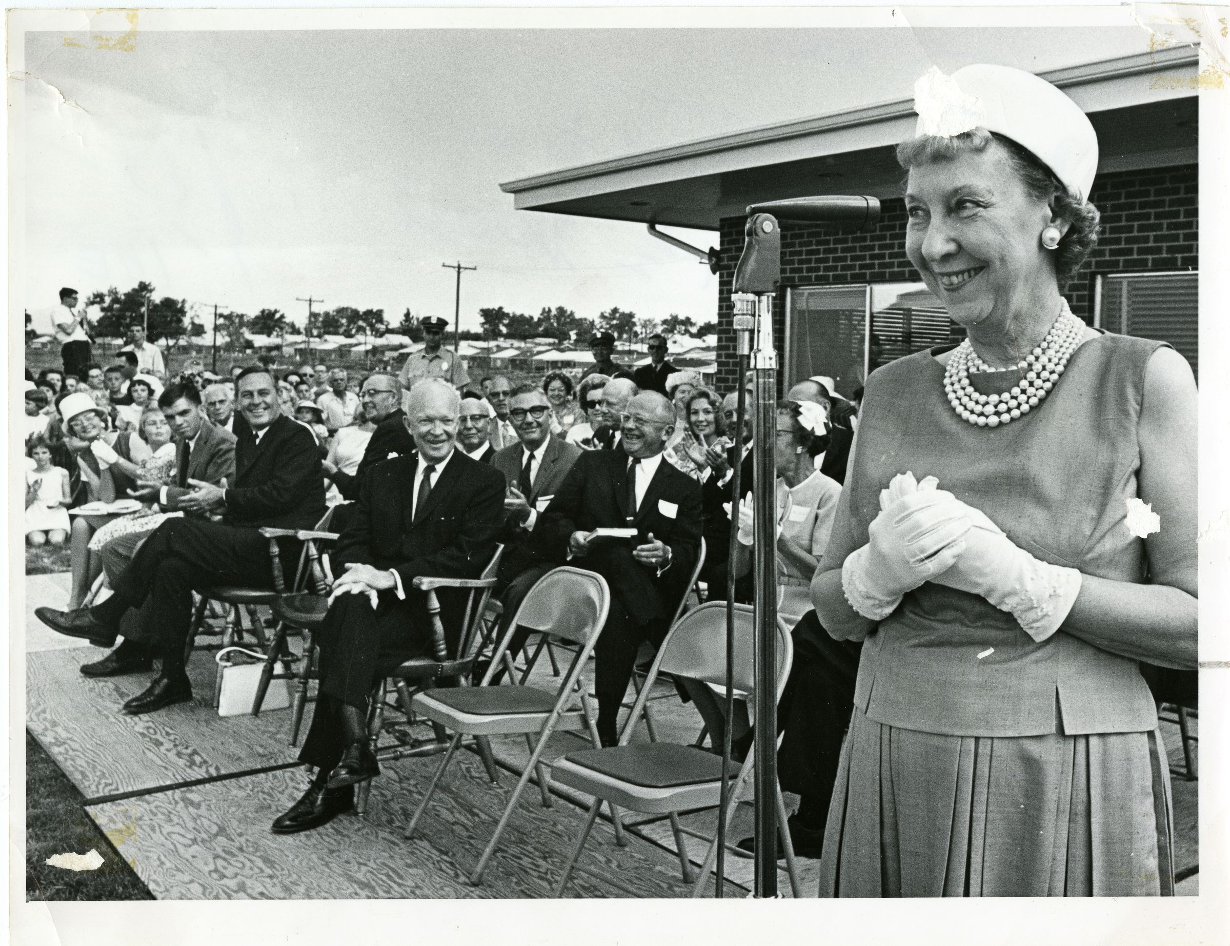 Black and white photograph print of Mamie Doud Eisenhower speaking at the dedication of her namesake's library, dated July 7, 1963. The print is 6.5" x 8.5". The image shows Mamie at a microphone stand to the right, looking beyond the photographer's vantage point at a gathered crowd. Several individuals are sitting in seats behind her and to the left, with several onlookers sitting in grass in the background. Her husband, Dwight D. Eisenhower, can be seen in the front row of seats immediately to the left of Mamie. Roger Knight and Askel Nielsen (left to right), two close friends of the Eisenhowers who lived in Denver and invested heavily in the development of the Broomfield Heights community, are likely sitting just behind Dwight. The Mamie Doud Eisenhower Library is visible just behind Mamie, to the right.