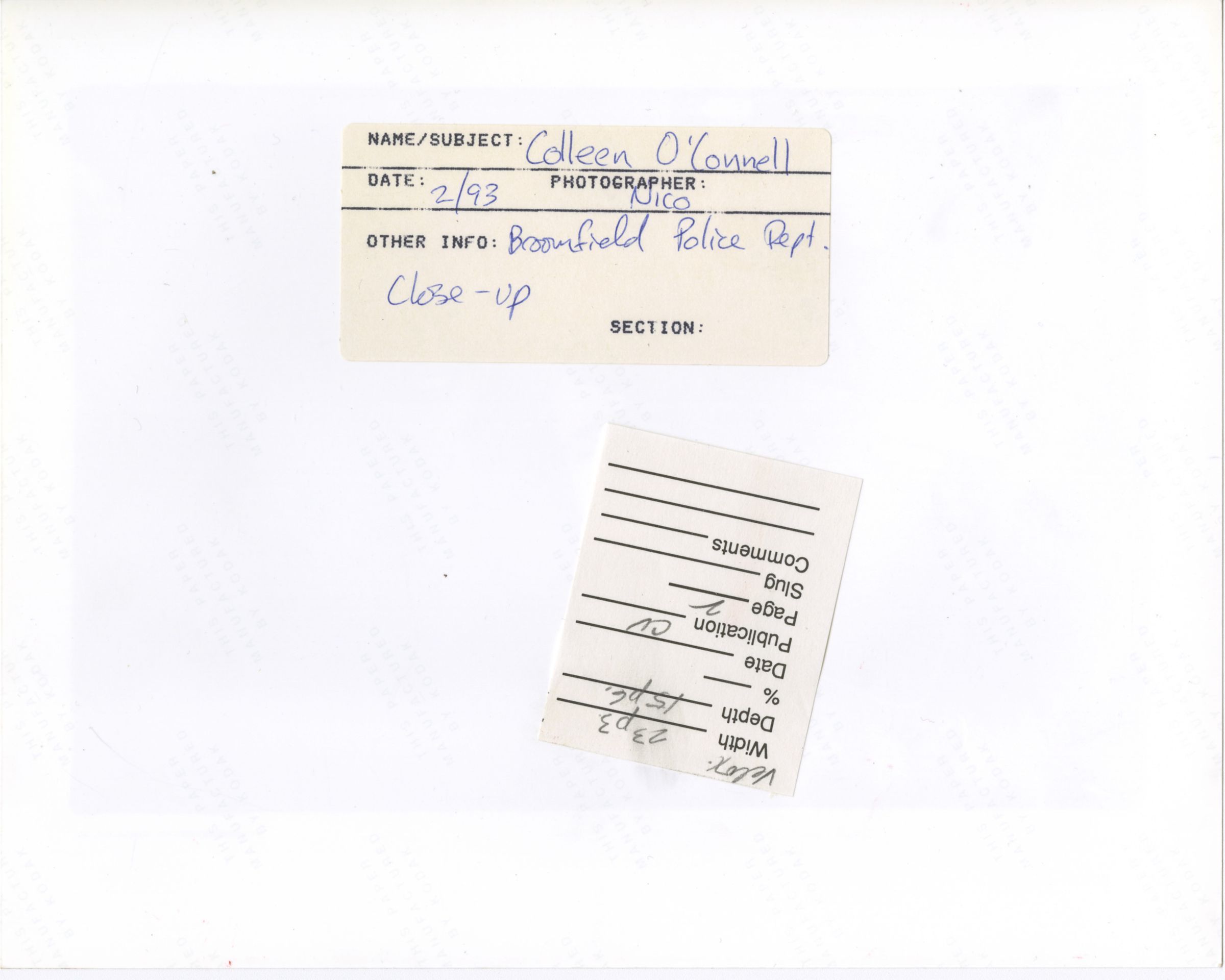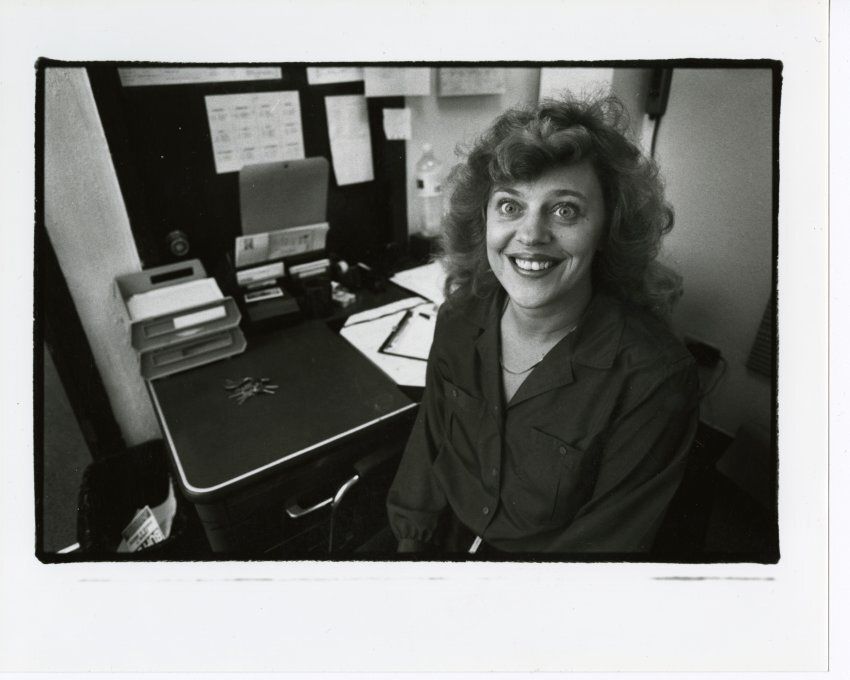 Black and white photograph of Colleen O'Connell of the Broomfield Police Department taken by a Boulder Daily Camera photographer to be used in a February 8 edition of the newspaper. O'Connell is sitting in front of a desk in the Broomfield Police Department and City Hall Building at 6 Garden Center. Notes from the newspaper's subject filing document for this image describe O'Connell as "a detective who works sex assault and juvenile cases, including the Ballard case."