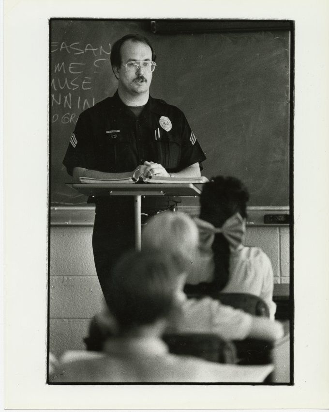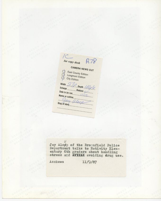 Black and white photograph of Broomfield Police Officer Jay Alsup standing at a podium at the front of a classroom. This image was taken by a staff photographer for the Boulder Daily Camera. A white adhesive label stuck to the back of the photo says "Jay Alsup of the Broomfield Police Department talks to Nativity Elementary 6th graders about handling stress and avoiding drug use. Asakawa, 11/9/87."