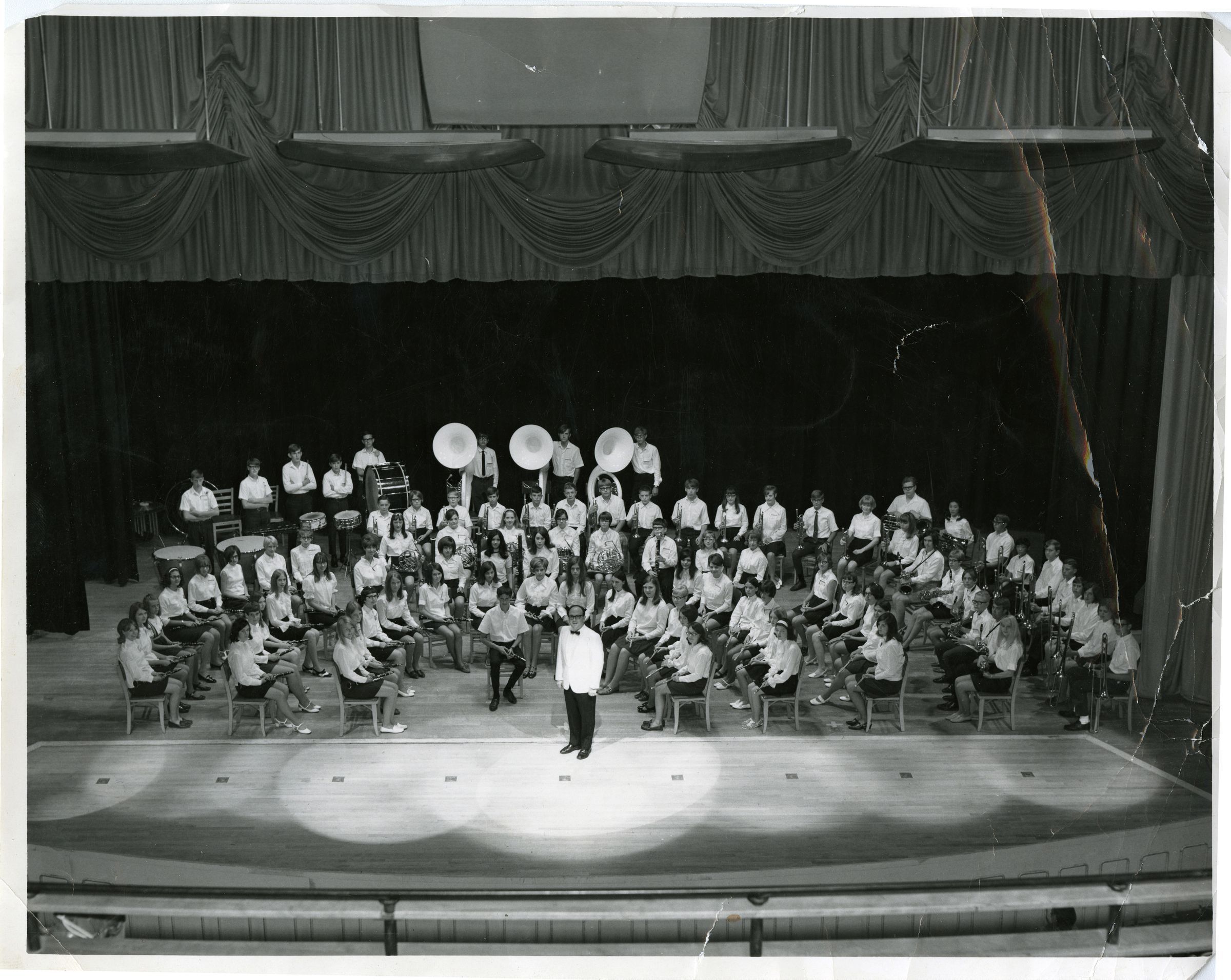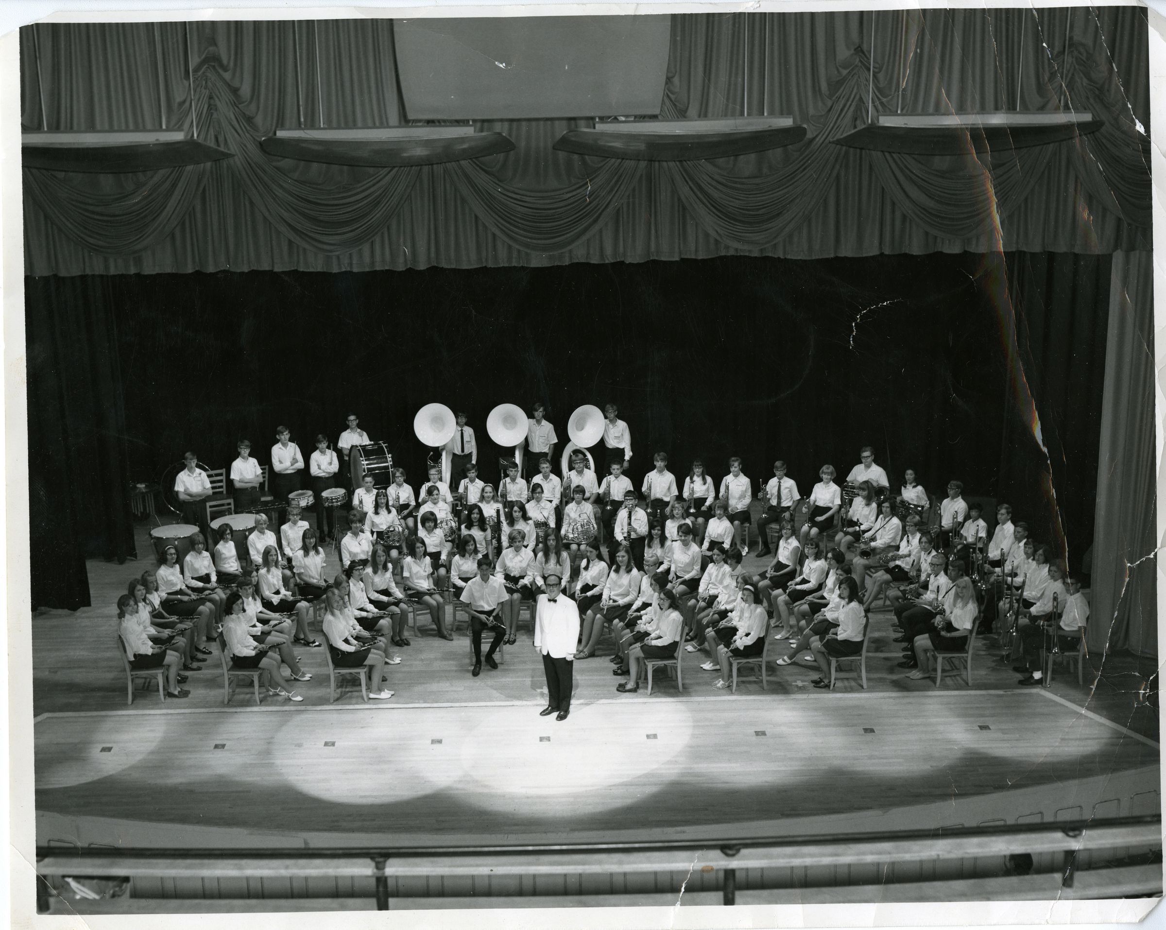 Black and white photograph print of the Broomfield Junior High School concert band, circa 1968-1969. The print is 8" x 10", silver gelatin. The image shows the full band posing sitting in chairs on an auditorium stage, as if ready to perform in a concert. The band director is seen standing in front of them in a white suit and black bow tie, facing the camera. The photograph's original owner and donor, Sharon Campbell (nee Sauer), is seen fourth from the left in the third row, in the clarinet section.Photograph Details