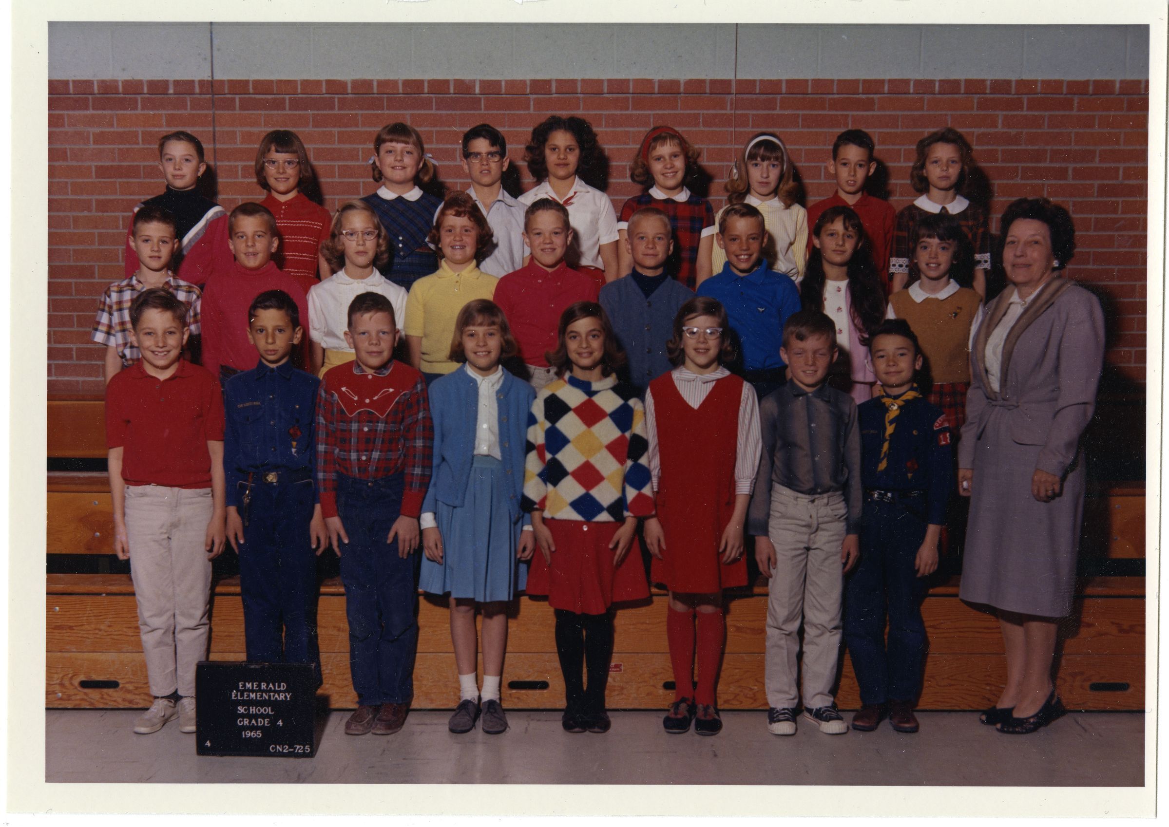 Color photograph print of a 4th grade class at Emerald Elementary School, 1965. The print (2017.18.5a) is 5" x 7," framed in a larger matte autograph card (2017.18.5b). The image shows 26 students in three rows posing in front of collapsed wooden gym bleachers, presumably at the school. The teacher, identified as "Mrs. Miller" by the photograph's original owner, Sharon Campbell (nee Sauter), is standing to the right. Sharon is standing five from the left in the back row.