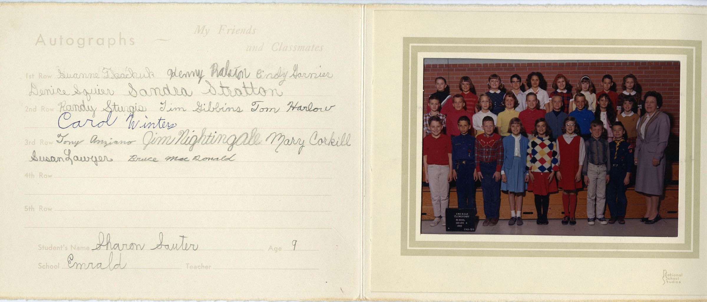 The autograph card is made of a paper board and folded, blue on the outside. The card opens to show several autographs of Sharon's classmates on the inside along with the photograph, and lists that she is nine years old and attending Emerald. "National School Studios" is listed as the photography studio in the lower right corner of the card.Collection