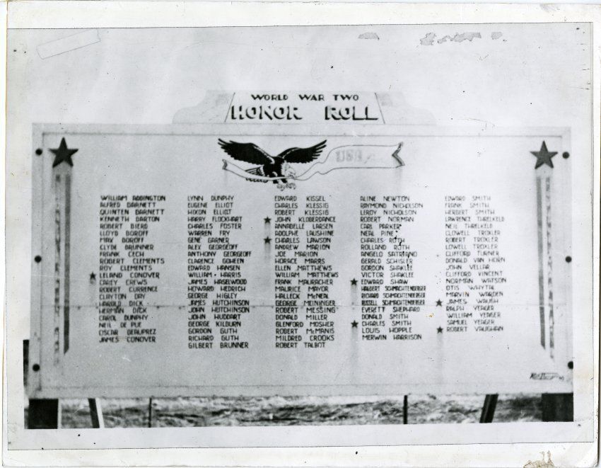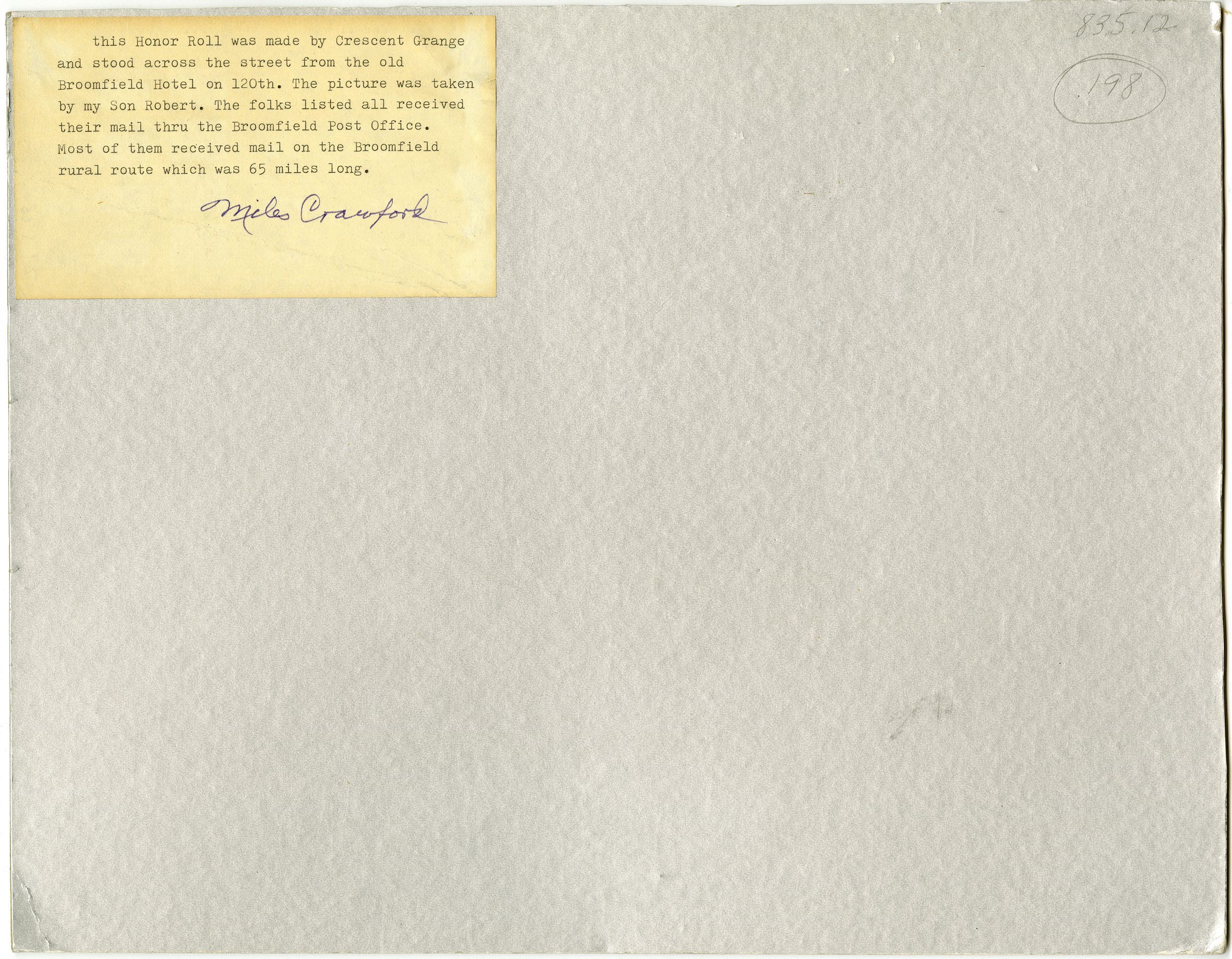 Black and white photograph print of a World War II Honor Roll sign in Broomfield, circa 1945-1955. The print is 11" x 14", mounted on a card board with glue, possibly a copy print made at a later date. The image shows the full sign with an illustrated picture of an eagle on the front. Several names of soldiers, many Broomfield residents, are displayed in five columns. The names Leland Conover, John Kloberdance, Charles Lawson, Edward Shaw, Charles Smith, James Waugh, and Robert Vaughan all have stars next to them. According to a typed description by Miles Crawford glued to the back, his son, Robert, took the photograph. The sign was made by the Crescent Grange in Broomfield and posted across from the Old Broomfield Hotel on 120th. The note also mentions how all of the soldiers were served by the mail route through Broomfield Post Office. Miles and his father, Harry Crawford, both served as Postmasters in Broomfield.Photograph Details