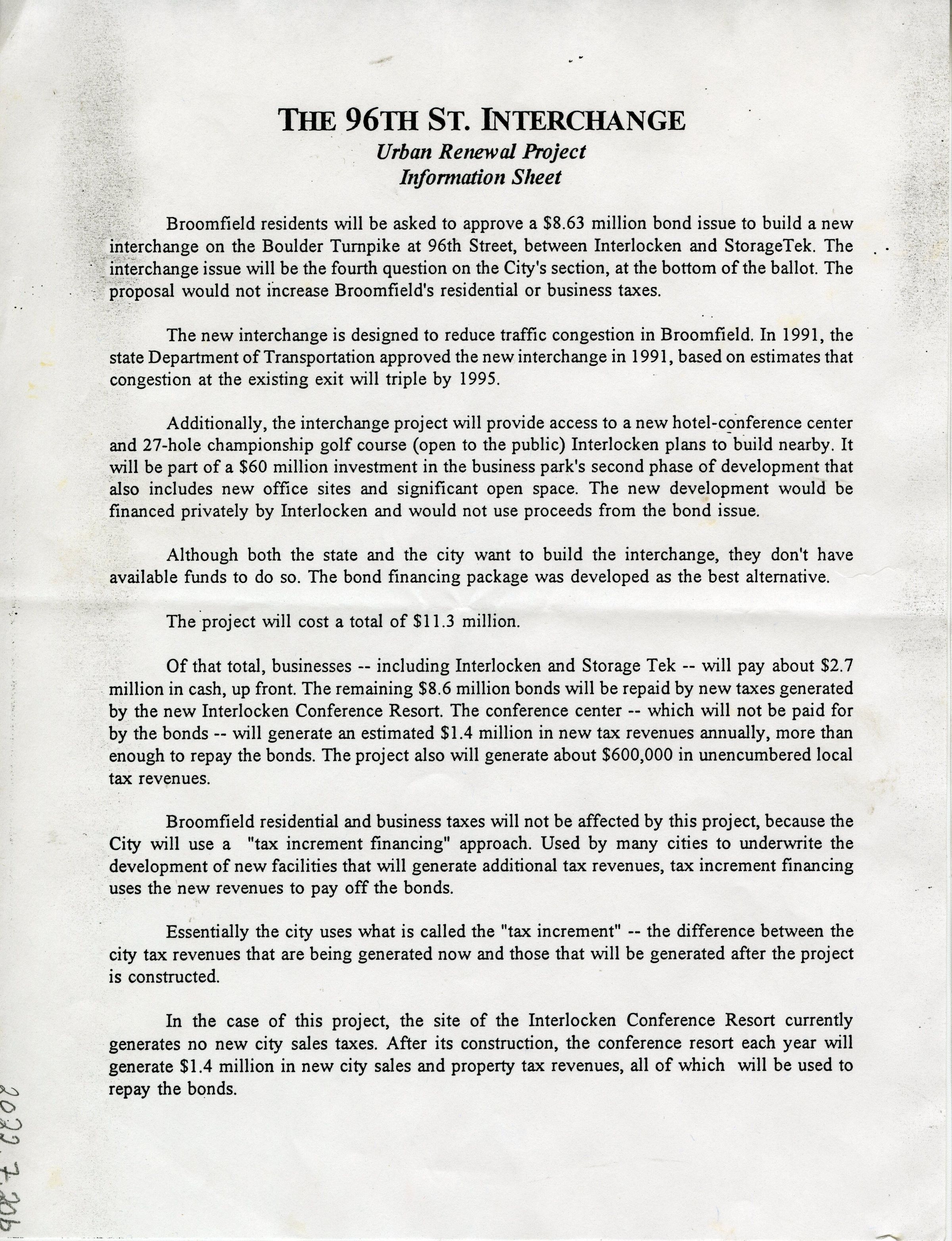 96th Street Interchange Year 1. Urban Renewal Project Information Sheet. Broomfield residents will be asked to approve a $8.63 million bond issue to build a new interchange on the Boulder Turnpike at 96th Street between Interlocken and Storage Tek. The interchange issue will be the fourth question on the city's section at the bottom of the ballot. The new Interchange is designed to reduce traffic congestion in Broomfield. The project will cost $11.3 million.