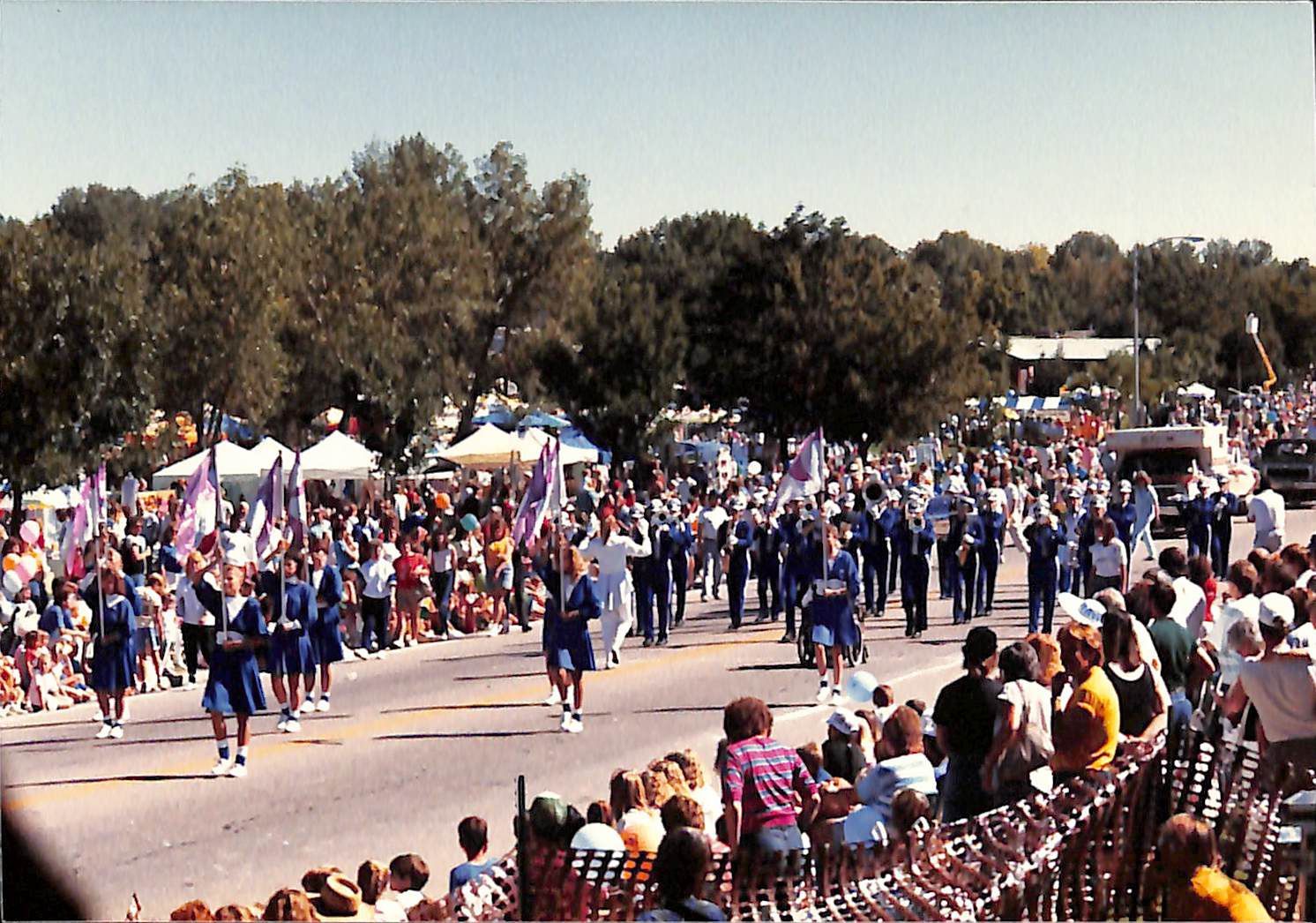 Item is a photograph printed on Kodak paper taken during the 1989 Broomfield Days celebration. The photo centers around a street with large crowds gathered on either side of it to watch the parade taking place. At the front, women dressed in blue walk up the street holding flags above their heads, while a marching band behind them plays music. Behind the marching band are a camper van and truck. In the distance, there are white tents and booths set up, no doubt hosting more Broomfield Days festivities. Huge trees in the distance complete the view, and above them, the sky is pale blue.Photograph Details