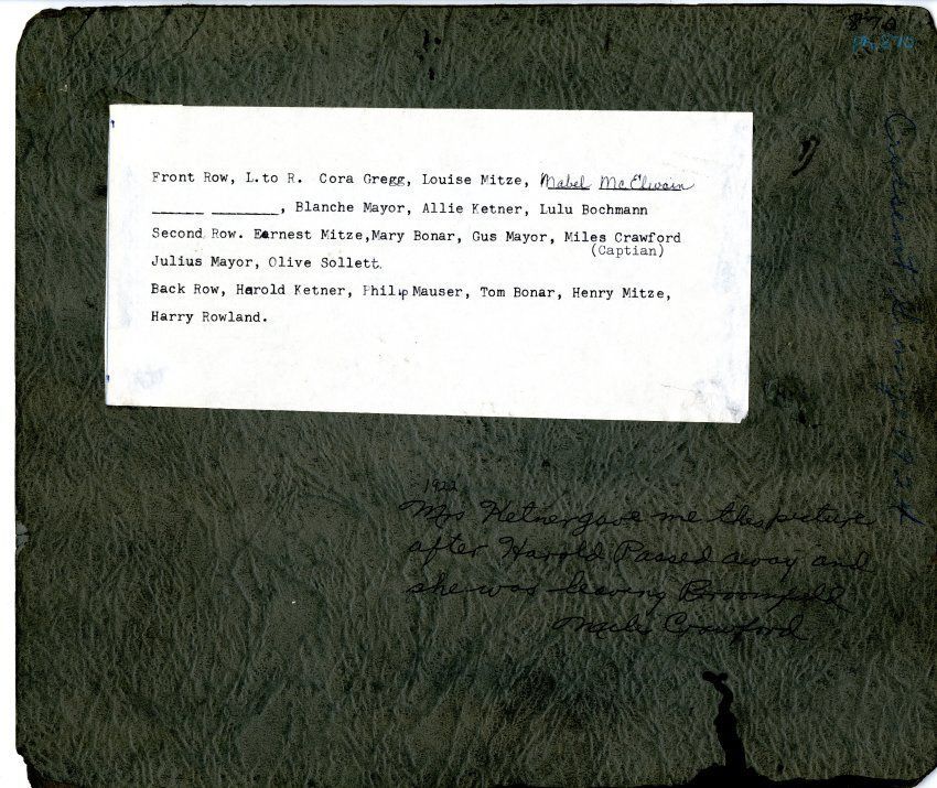 Second Row: Ernest Mitze, Mary Bonar, Gus Mayor, Miles Crawford (captian), Julius Mayor, Olive Sollett.