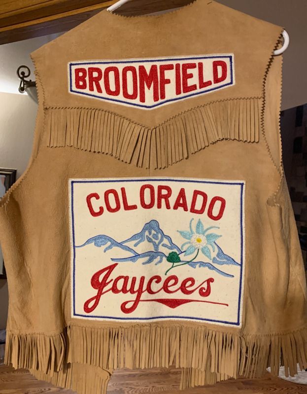 Suade western-style leather vest with tassels, and scalloped edges. Light brown. Likely worn on Broomfield Days and other events the Jaycees attended.