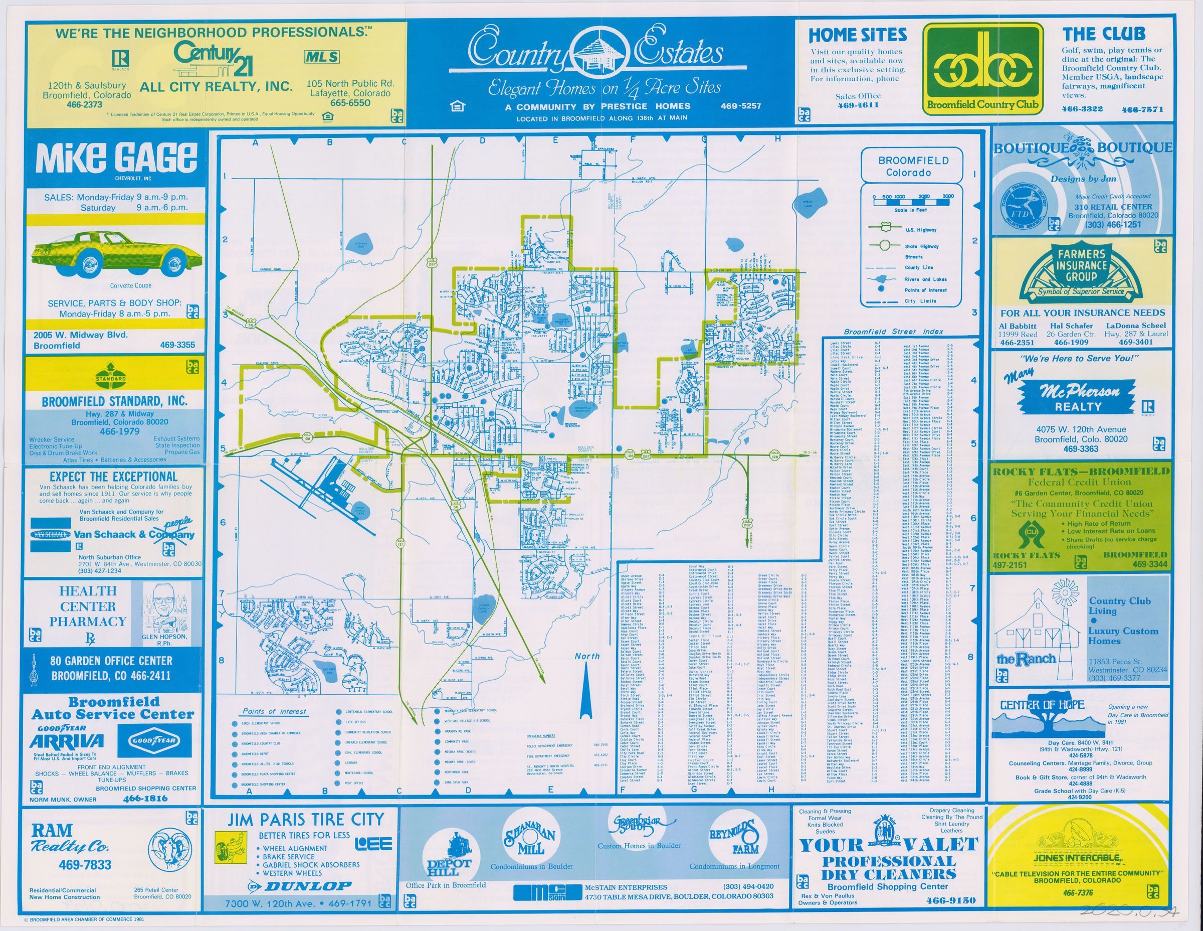 Map of Broomfield, CO in 1981, showing the city limits, street names, Various points of interest, US Highways, State Highways, County Lines, Rivers, Lakes, and with advertisements all along the outside.