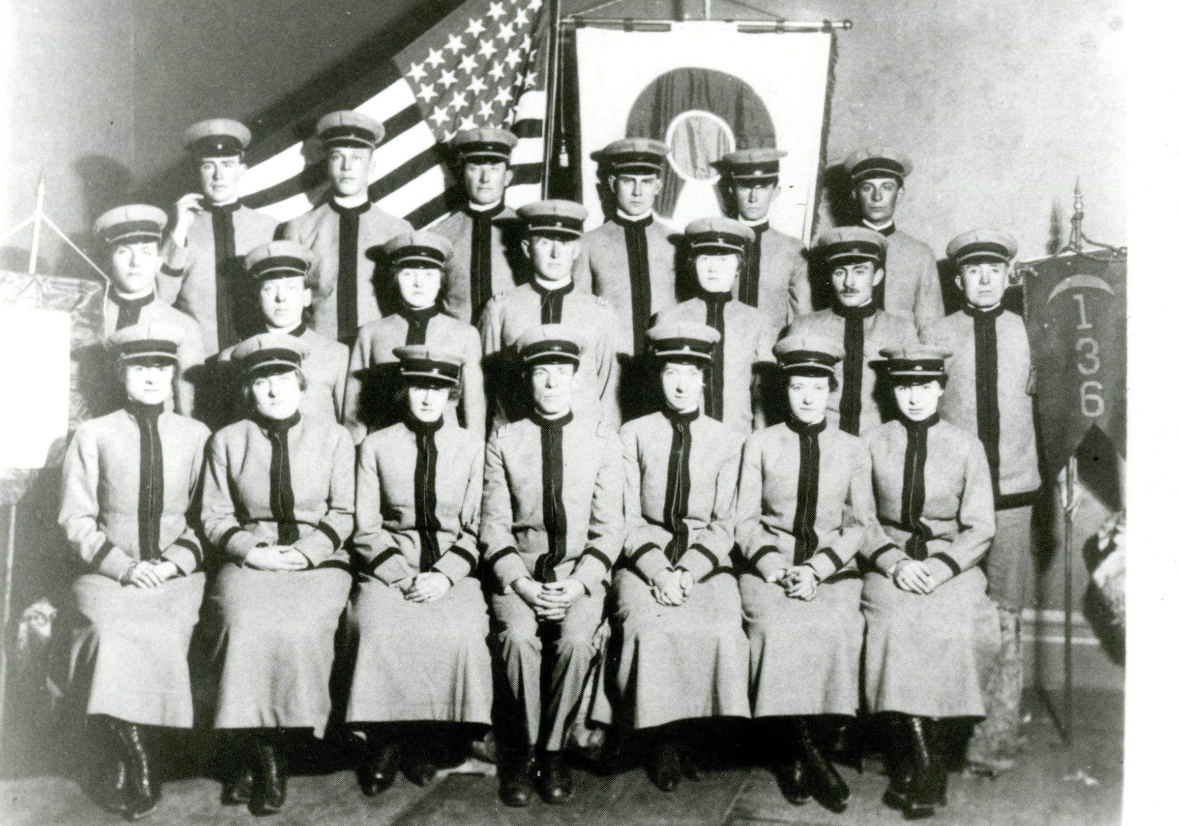 Photograph taken appx. January 21, 1922 of the Broomfield Drill Team in the Cresent Grange. Donated by Mrs. J.C. Mott - 1133 Pontiac - Denver - 80220. Shows three rows of 20 young adults in uniform with American and Colorado flags behind them. Sitters are unidentified.