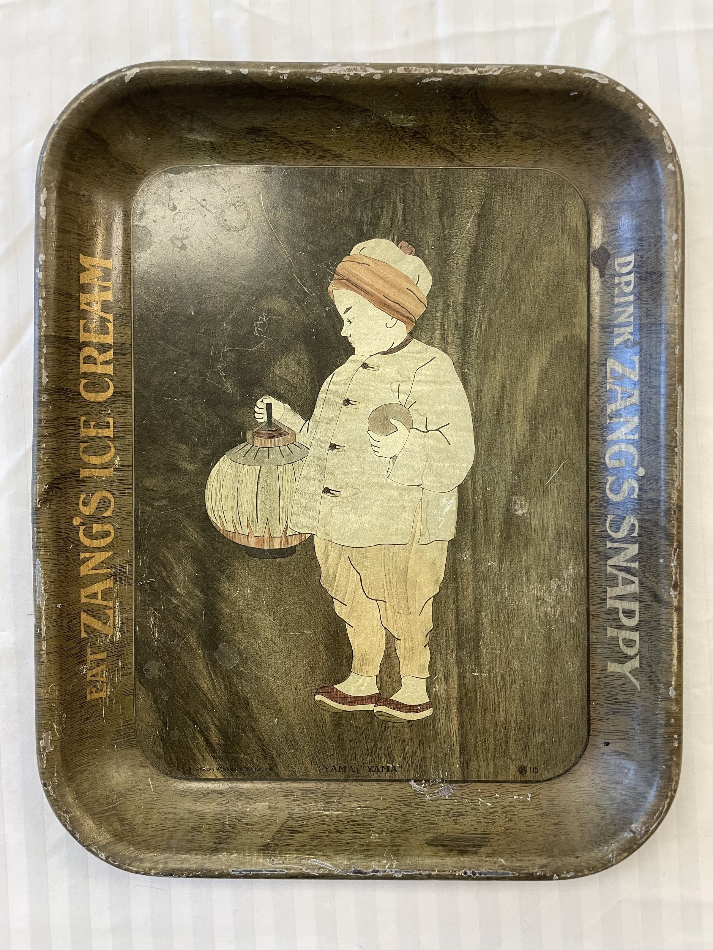 Metal tray advertising "Eat Zang's Ice Cream" and "Drink Zang's Snappy". Tray is metal (likely aluminum) printed to look like wood. Features an image of a Chinese or Asian boy holding what looks to be a paper lantern. Underneath the image is Yama Yama". Also marked "The American Artworks Coshocton, Ohio AAW 115".