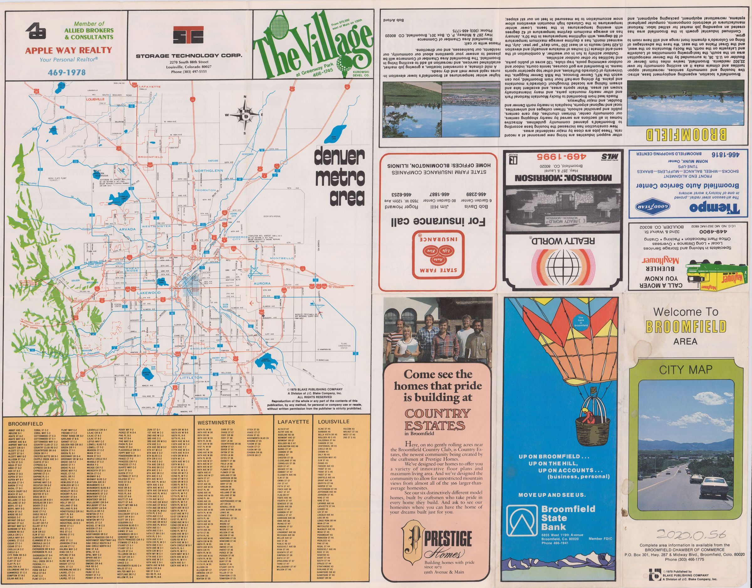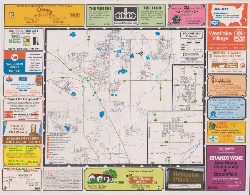 Map of Broomfield, CO in the 1990s, showing the city limits, street names, Various points of interest, US Highways, State Highways, County Lines, Rivers, Lakes, and with advertisements all along the outside.Lexicon