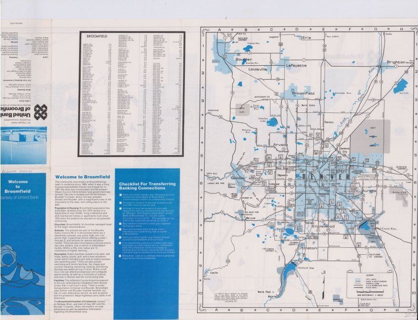 Map of Broomfield from the 1960s, with a particular emphasis and label on the United bank of Broomfield. Made by hotchkiss mapping company, with a map of the broader denver metro area on the back side.