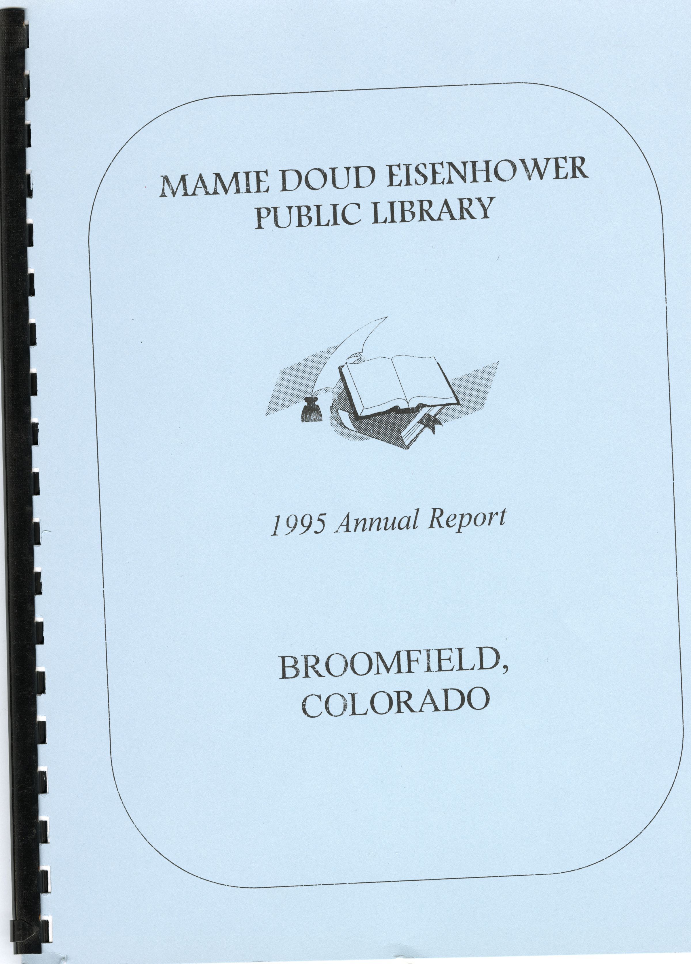 Item is a spiral-bound collection of papers from the Mamie Doud Eisenhower Library. This annual report from 1995 features a blue cover with the title and an image of books on it. The report covers information about the library, including activity schedules, budgeting for different departments, member statistics, and general descriptions of improvements made that year.