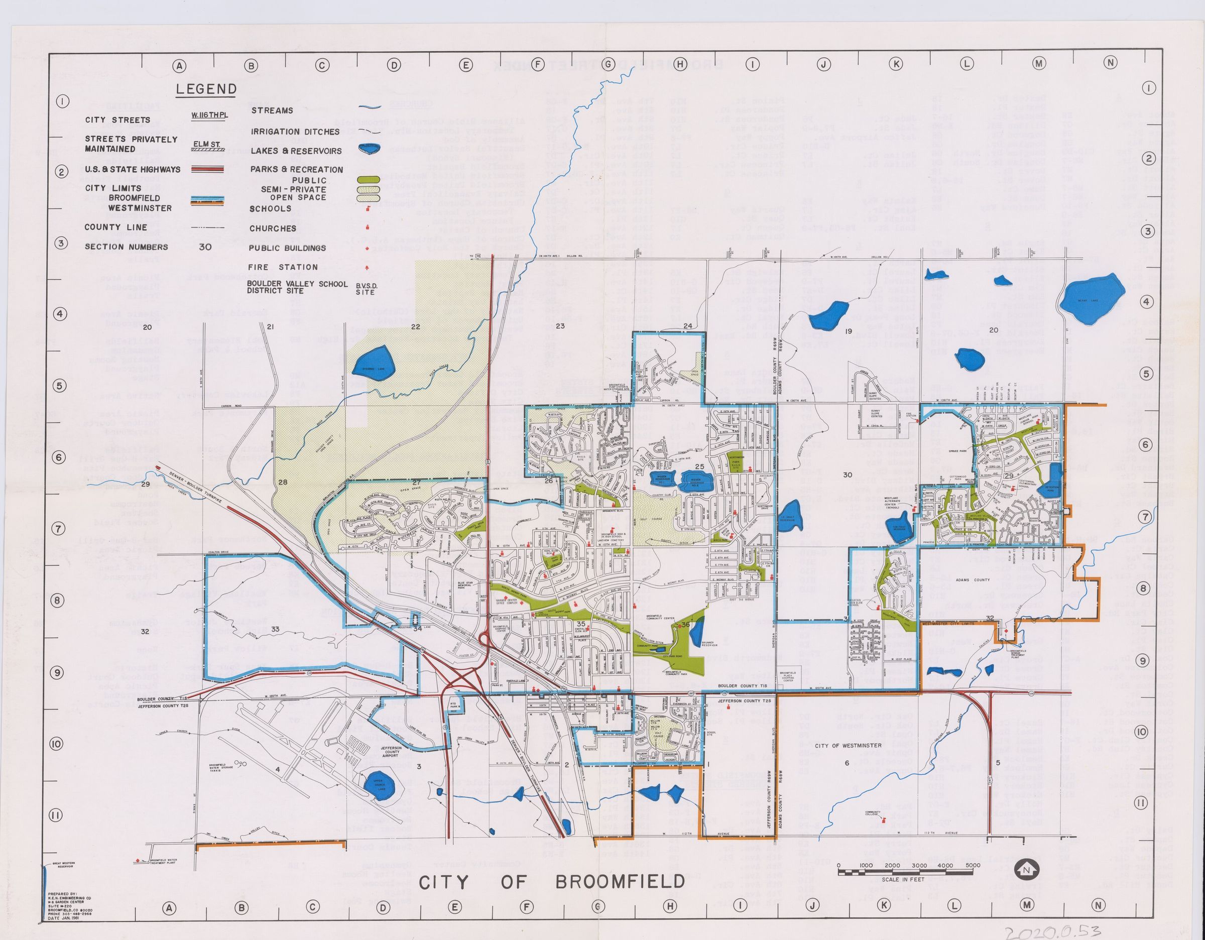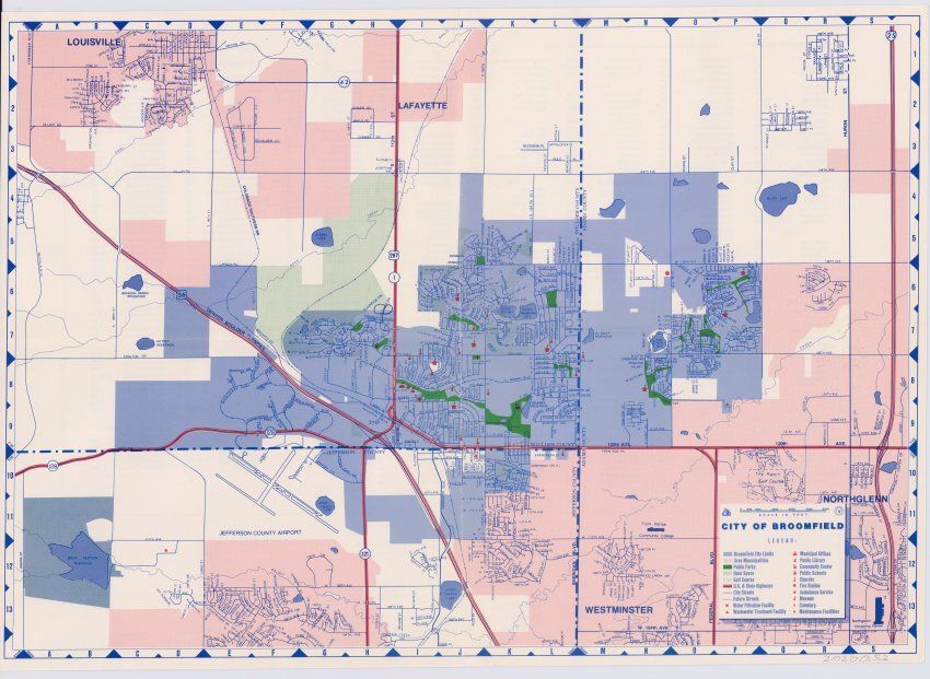 Shows a map of broomfield likely from the late 70s including city limits, streets, open space, planned streets, Offices, Libraries, Community Centers, Schools Churches, Fire stations, Museums, Cemeteries, highways, and various other things. A street name index can be found on the back.Lexicon