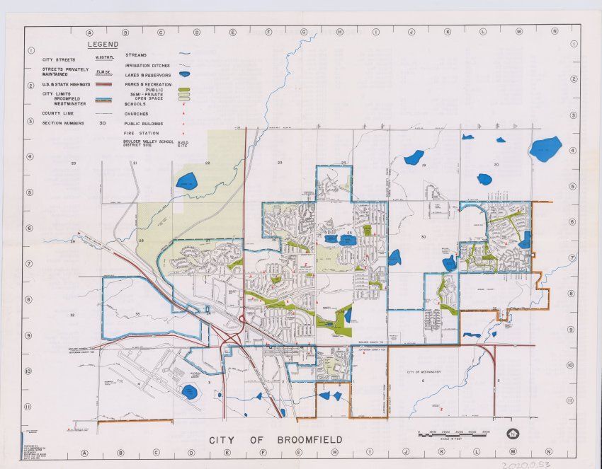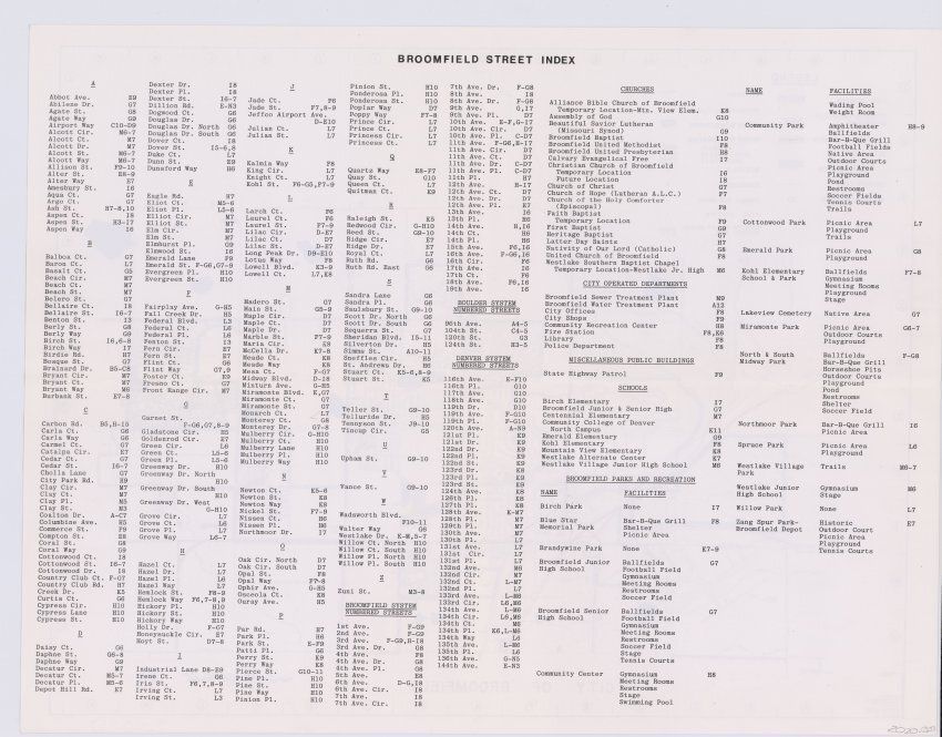 Map of Broomfield with streets, city limits, highways, county lines, points of interest, parks, open spaces, bodies of water, and Boulder Valley School district. A street name index can be found on the backLexicon