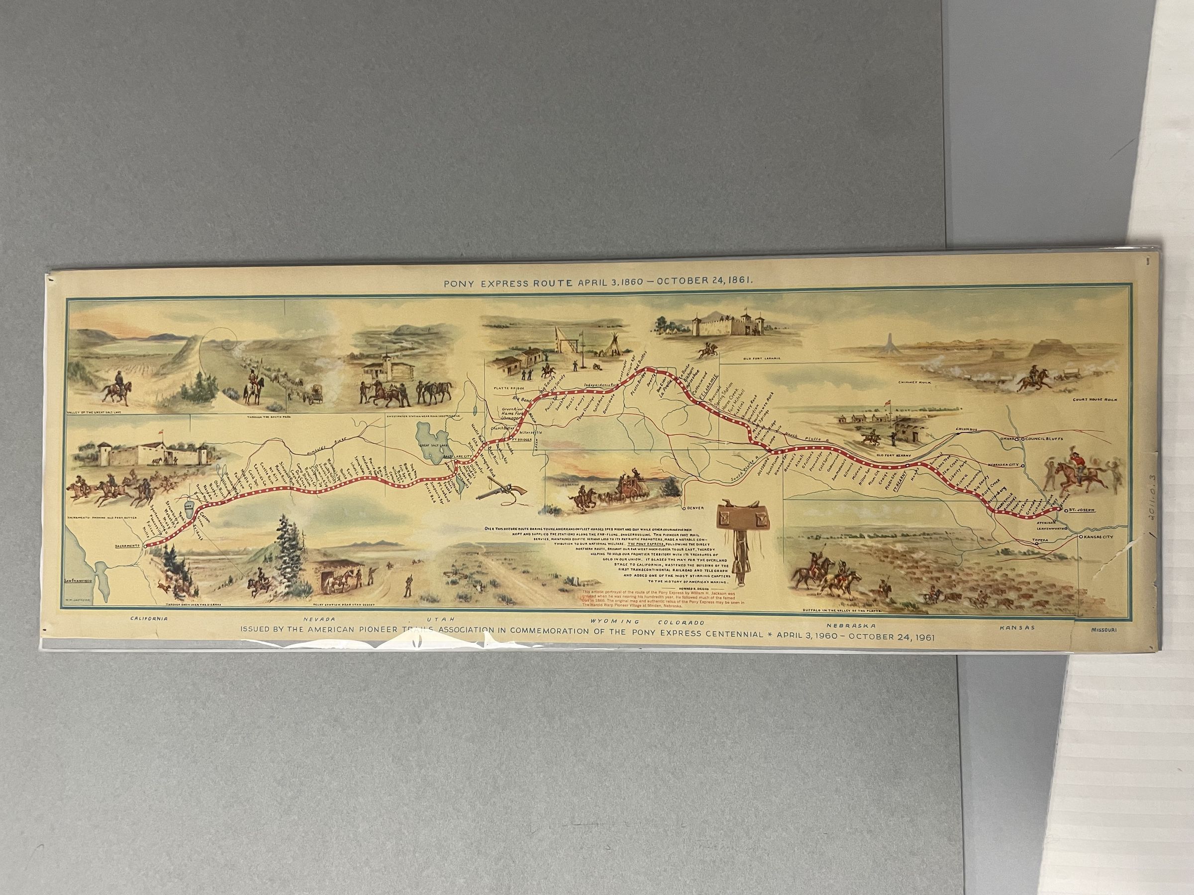A 1960s rendering of the Pony express route from St. Joseph, Missouri, to Sacramento California. The route goes through Missouri, Kansas, Nebraska, Colorado, Wyoming, Utah, Nevada, and California. Issued by the American Pioneer Trails association in commemoration of the Pony Express Centennial April 3, 1960-October 24, 1961"