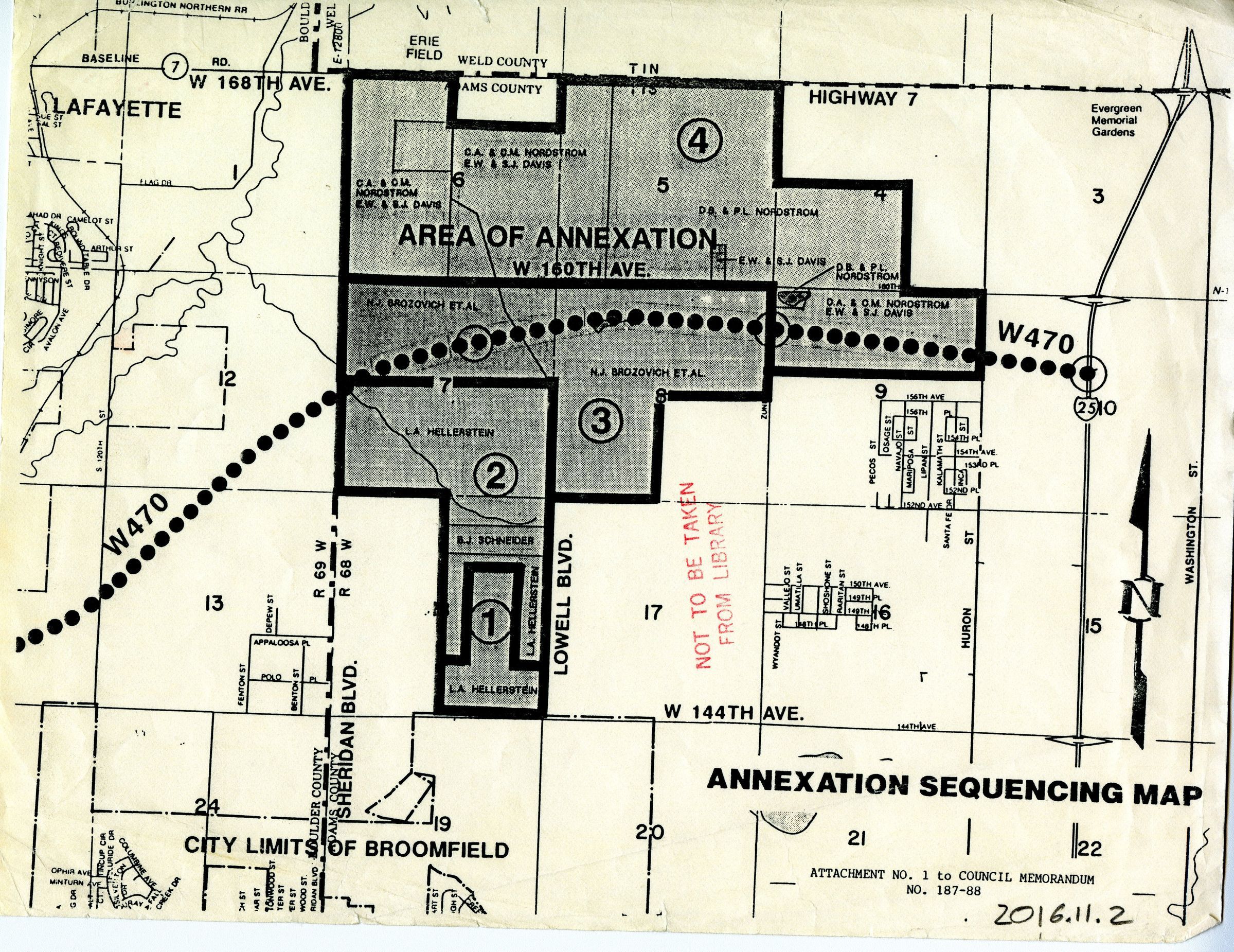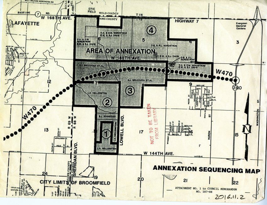 Shows a region to be annexed by broomfield, this region mostly lies between Highway 7, 160th ave., Sheridan Blvd, and Huron. The region intersects a map of Highway W470, which does not appear to be built yet.Collection