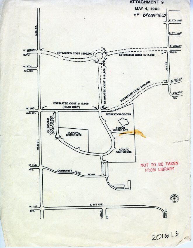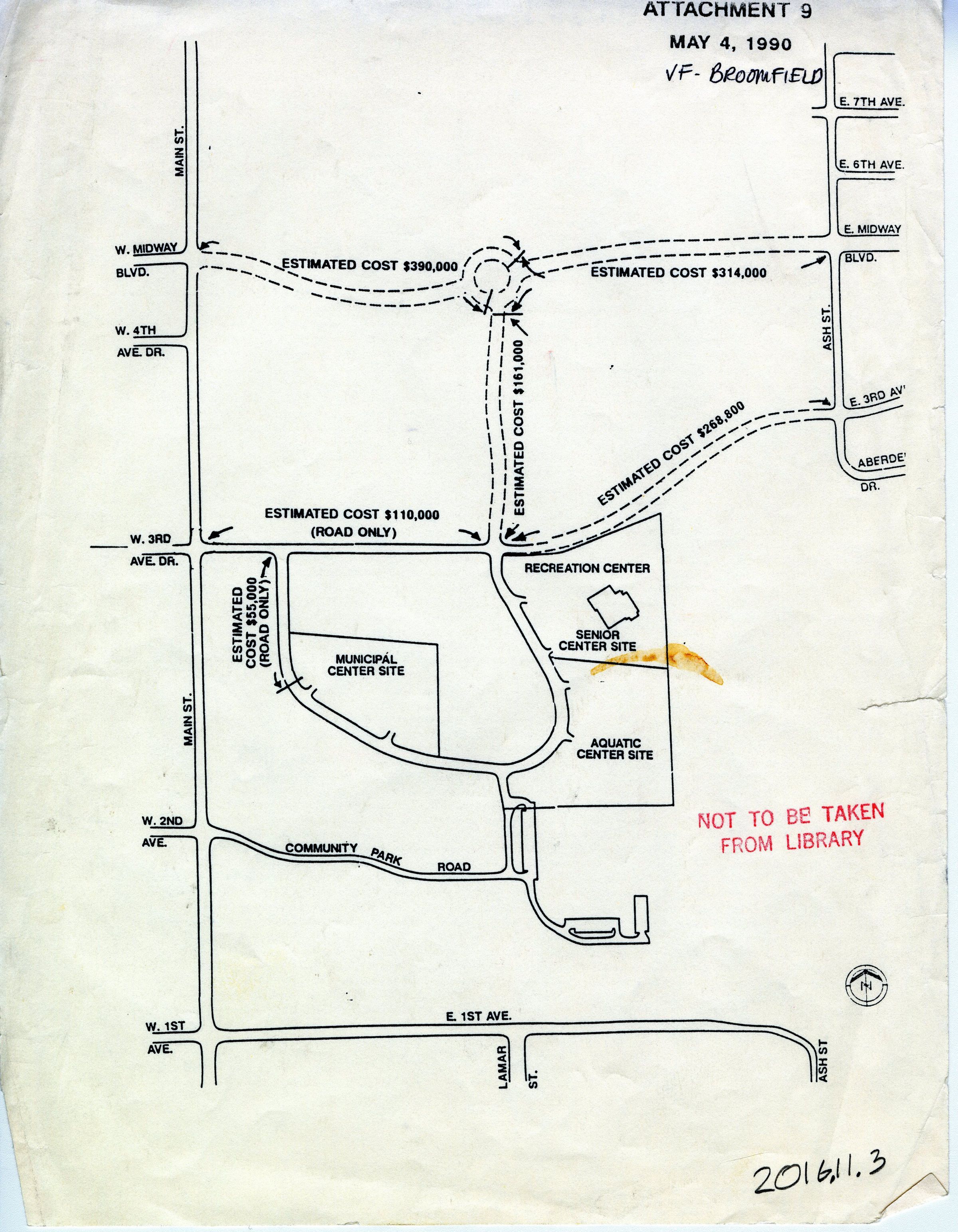 The map shows Midway and Spader way through The Field open space in central Broomfield. Curiously, it shows the intersection between the two streets are a roundabout, when a roundabout was never built in that location. It also shows a connection of 3rd avenue through the municipal center that was never built. Dated May 4, 1990 "Attachment"Collection