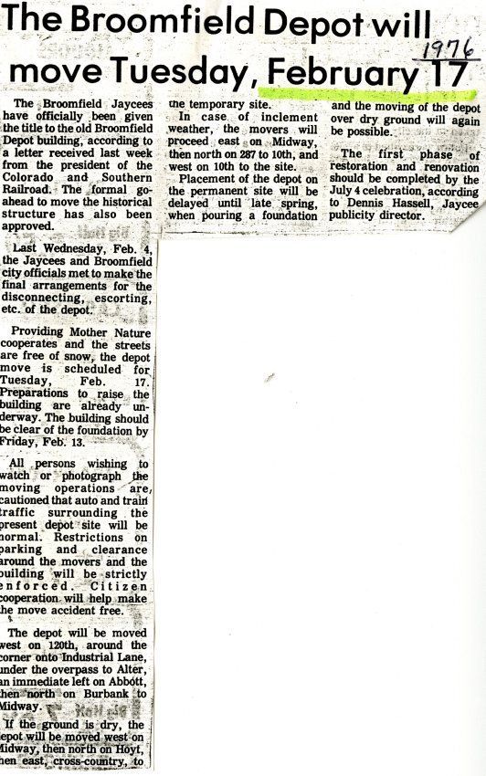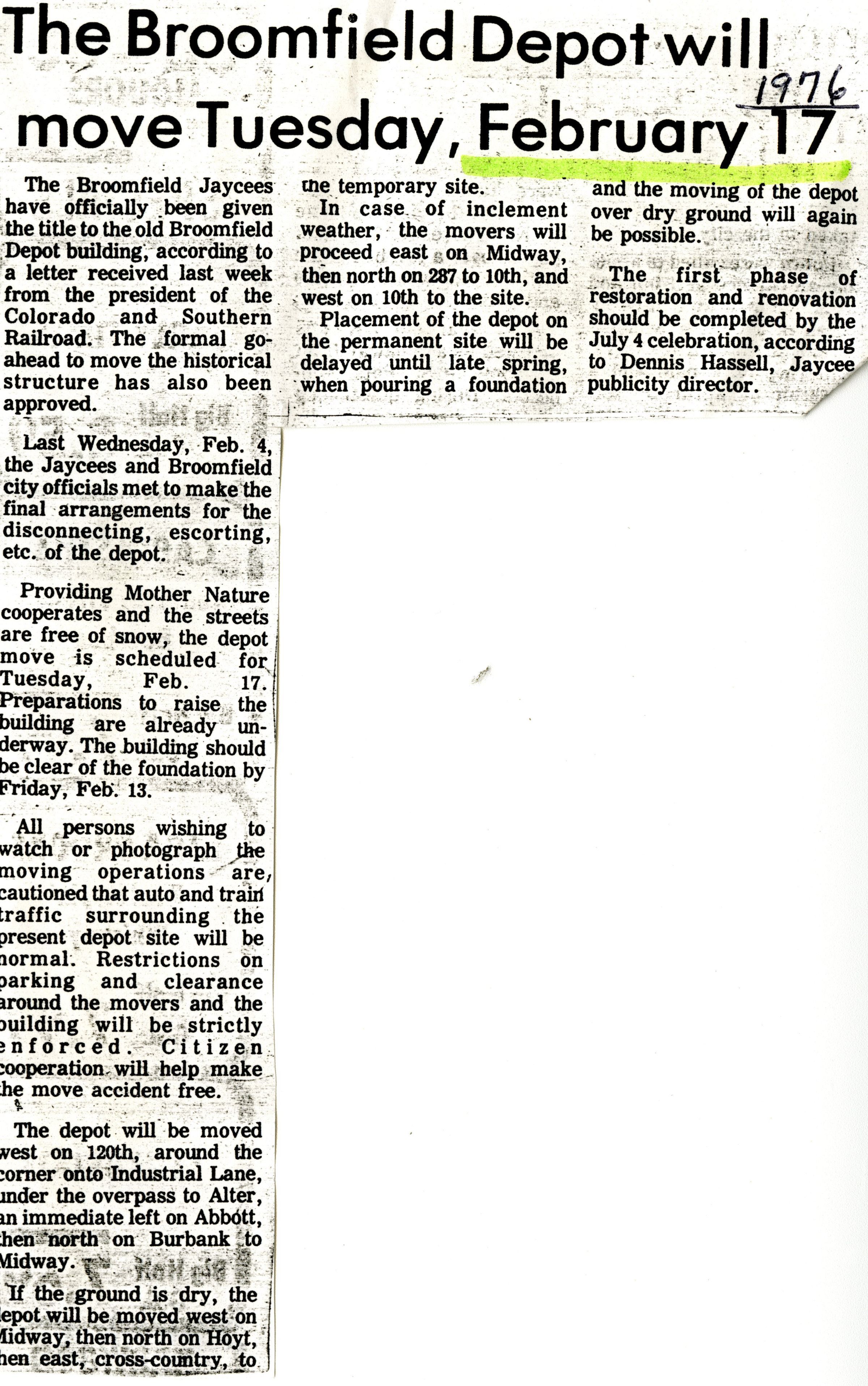 Photocopy of a newspaper clipping from 1976. The title is "The Broomfield Depot will move Tuesday, February 17". It discusses that it is a historical structure and where it will be moving and who will be involved. The person overseeing the move was the Jaycee publicity director, Dennis Hassell or at least who talked to the newspapers about the move.
