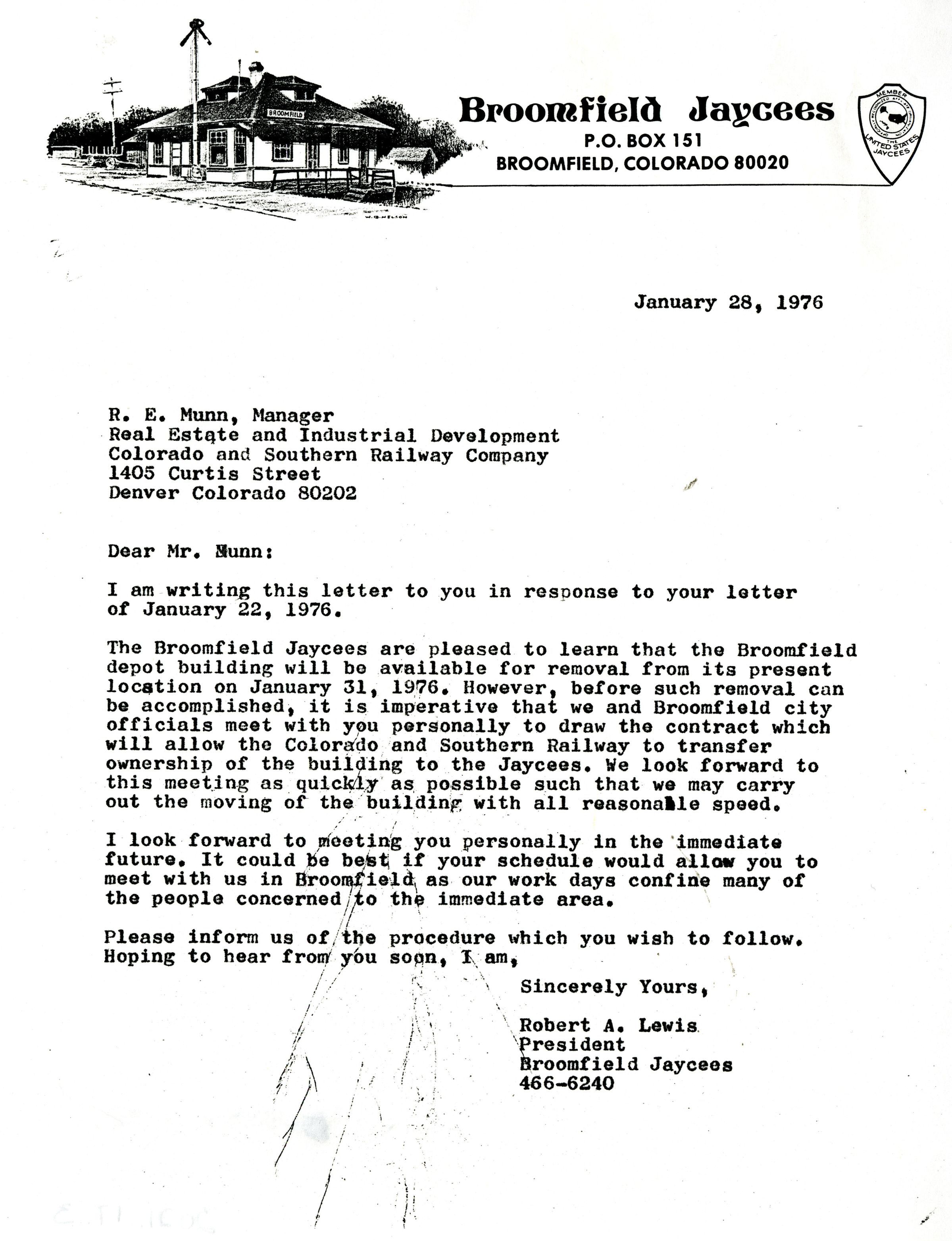 Drawing of the Broomfield Depot at the top left corner. From the Broomfield Jaycees. To R.E. Munn, Manager a Real Estate and Industrial Development Colorado and Southern Railway Company. It discusses when the Depot Museum will be ready to be moved and discusses a contract that needs to be completed. From the President of the Broomfield Jaycees, Robert A. Lewis. A photocopy.