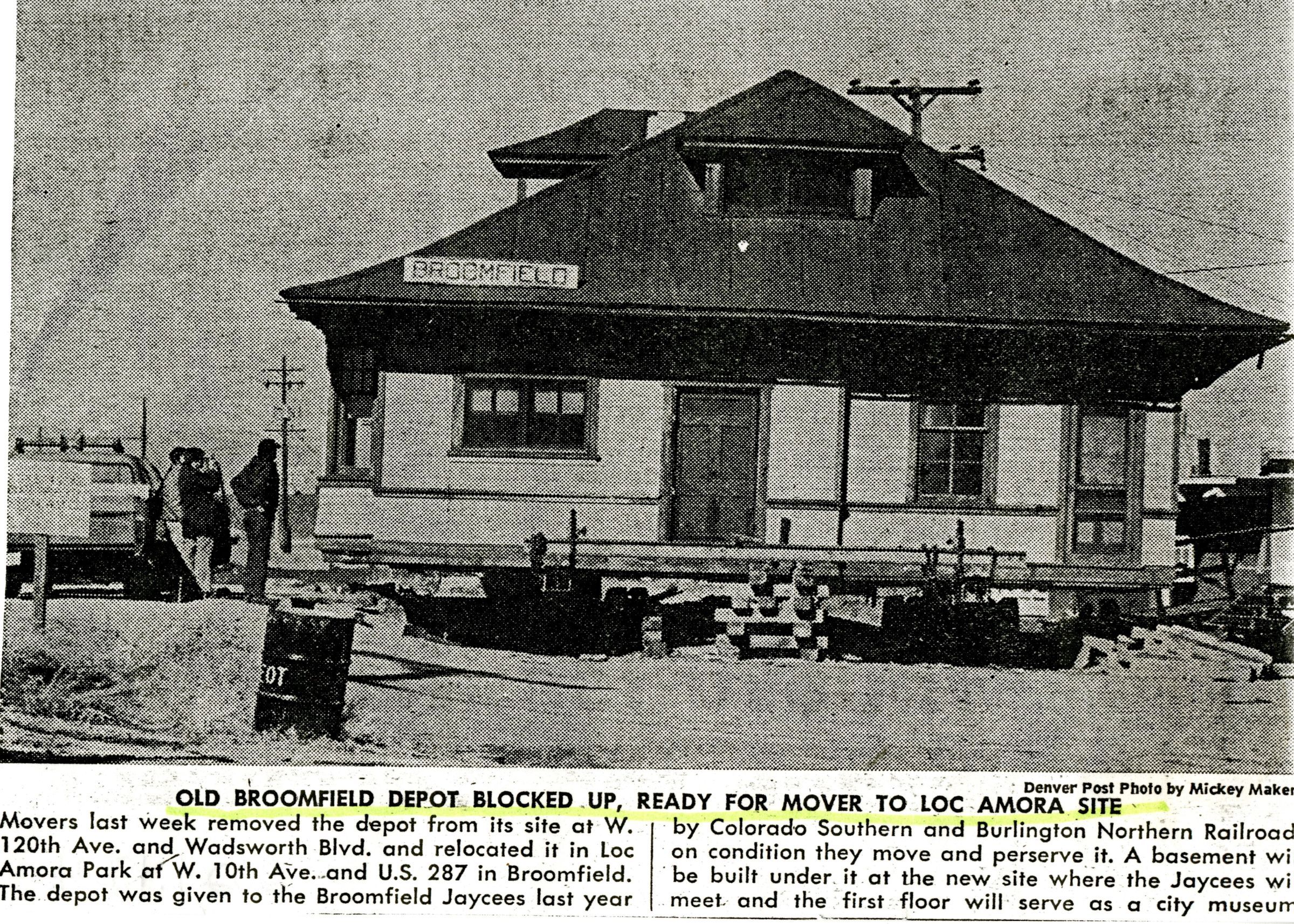 A photocopy from a newspaper. It has a picture of the Broomfield Depot Museum and has the title "Old Broomfield Depot Blocked Up, Ready for Mover to LOC Amora Site". It discusses the move of the Broomfield Depot's location and how it will become a city museum.