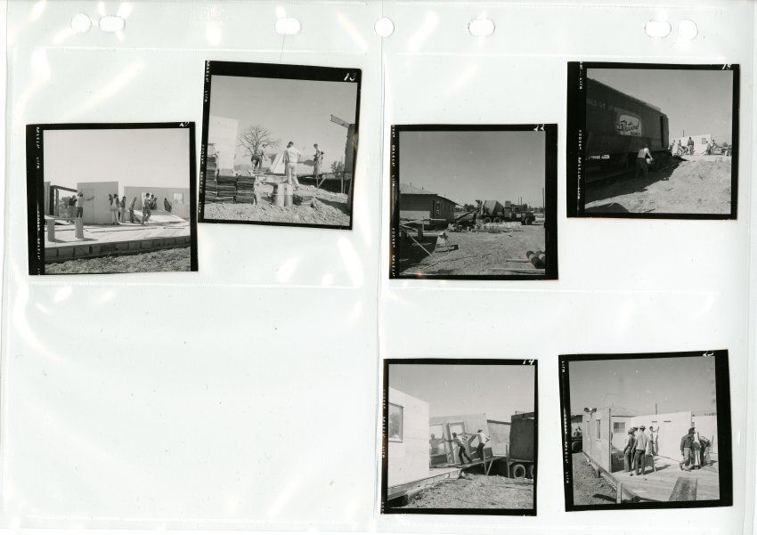 B&W contact sheet photo of construction workers putting up walls of building (house?) in Broomfield Heights. Nine men working on construction site. SIX images