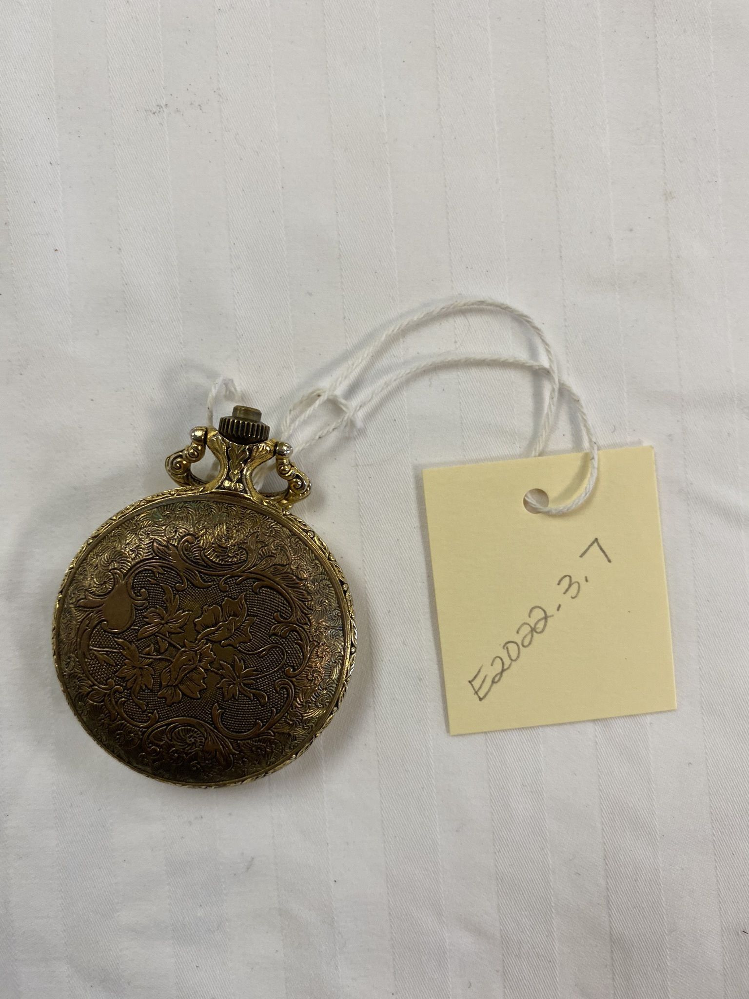 Gold plated pocket watch with a flying bird and a hunting dog lying in the reeds on the front of the watch.A floral design on the back of the watch.
